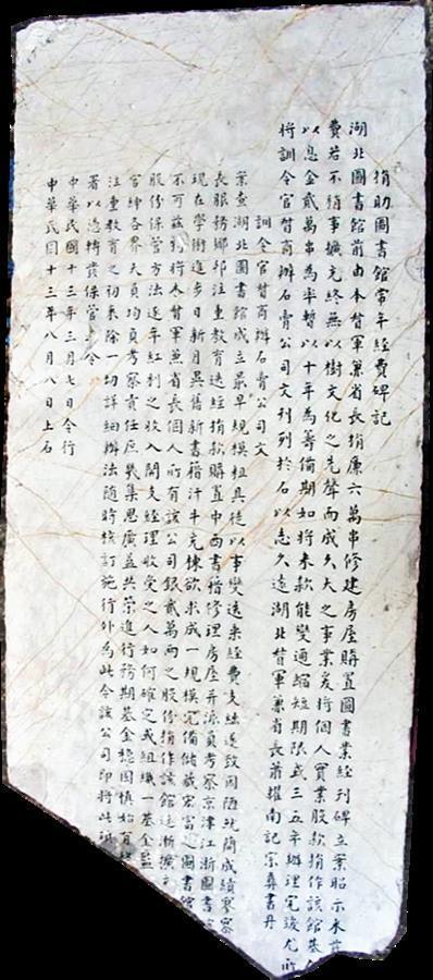 《东壁灵光——湖北省图书馆旧址考》作者昌庆旭,凭着对图书馆事业的热爱,以1980年一家单位挖排水沟发现的两块残碑为线索,挖掘出的湖北省图书馆最初建馆纪事残碑的历史图片。