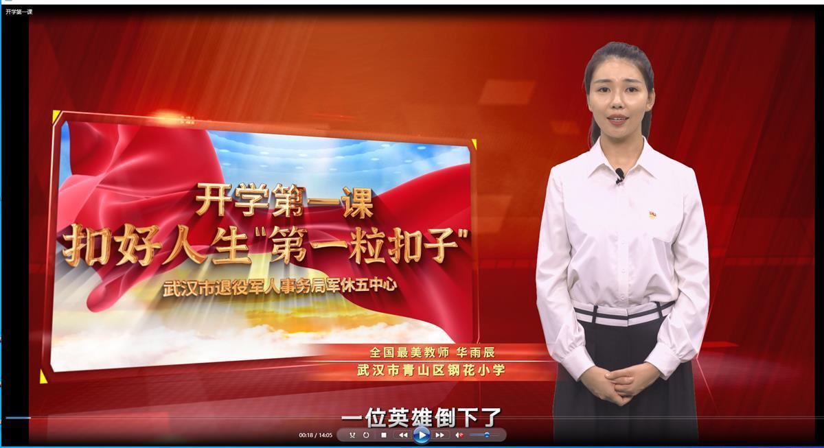 据悉,武汉市退役军人事务局军休五中心拍摄制作,全国最美教师、武汉市青山区钢花小学90后教师华雨辰讲述的《“开学第一课”——扣好人生第一粒扣子》视频还将陆续在其它学校播放。