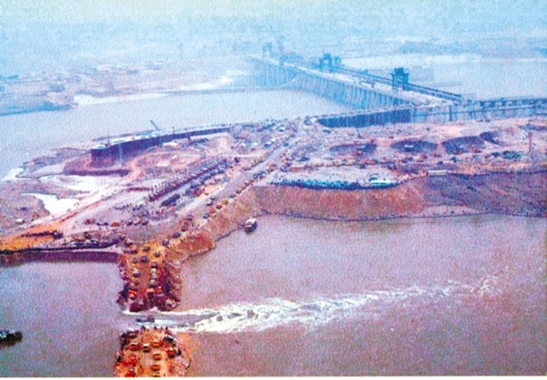 建设中的葛洲坝水利枢纽。