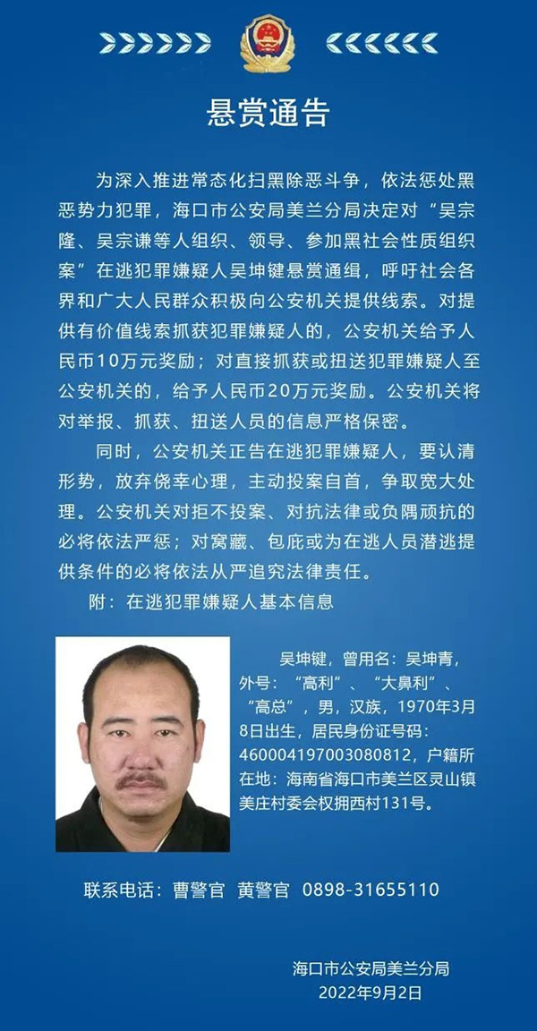9月2日,海南省海口市公安局美兰分局发布悬赏通告,决定对“吴宗隆、吴宗谦等人组织、领导、参加黑社会性质组织案”在逃犯罪嫌疑人吴坤键悬赏通缉,呼吁社会各界和广大人民群众积极向公安机关提供线索。