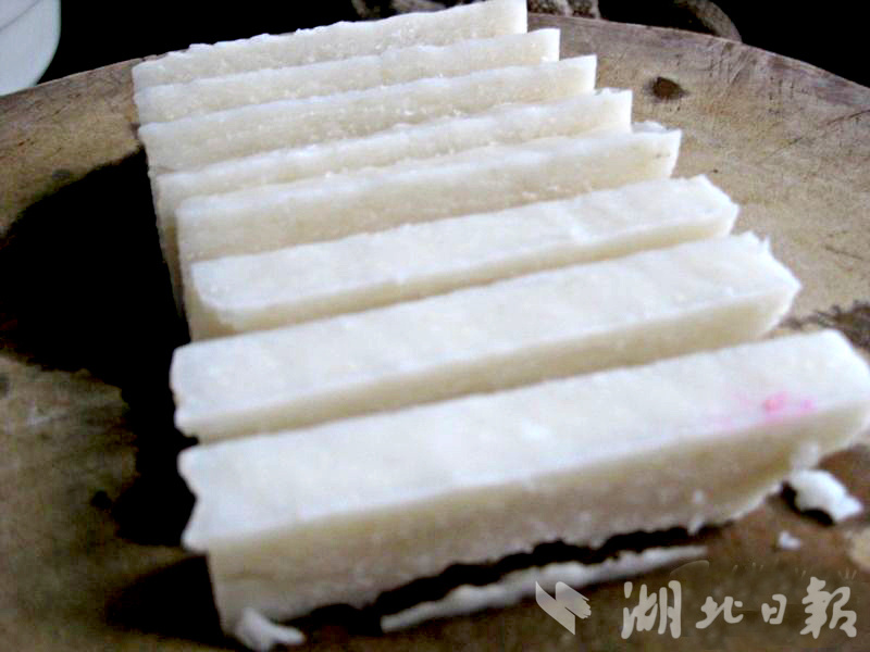 “糍粑”打成后,不能长久干放,那会成为切不动、砸不烂的铁板一块。要搁在一口大缸里,泡上净水存放。要吃就取出来,斩成条,再切成薄片——这就化整为零变成“年糕”了。孩子们雪夜围炉,除夕烤火时,最爱烧着吃。去几片“糍粑”煨在火灰里,不大一会儿就烤成两面金黄、内芯百嫩、鼓泡突起的“小枕头”,外壳焦香、内头糯软,别提多有味了!
