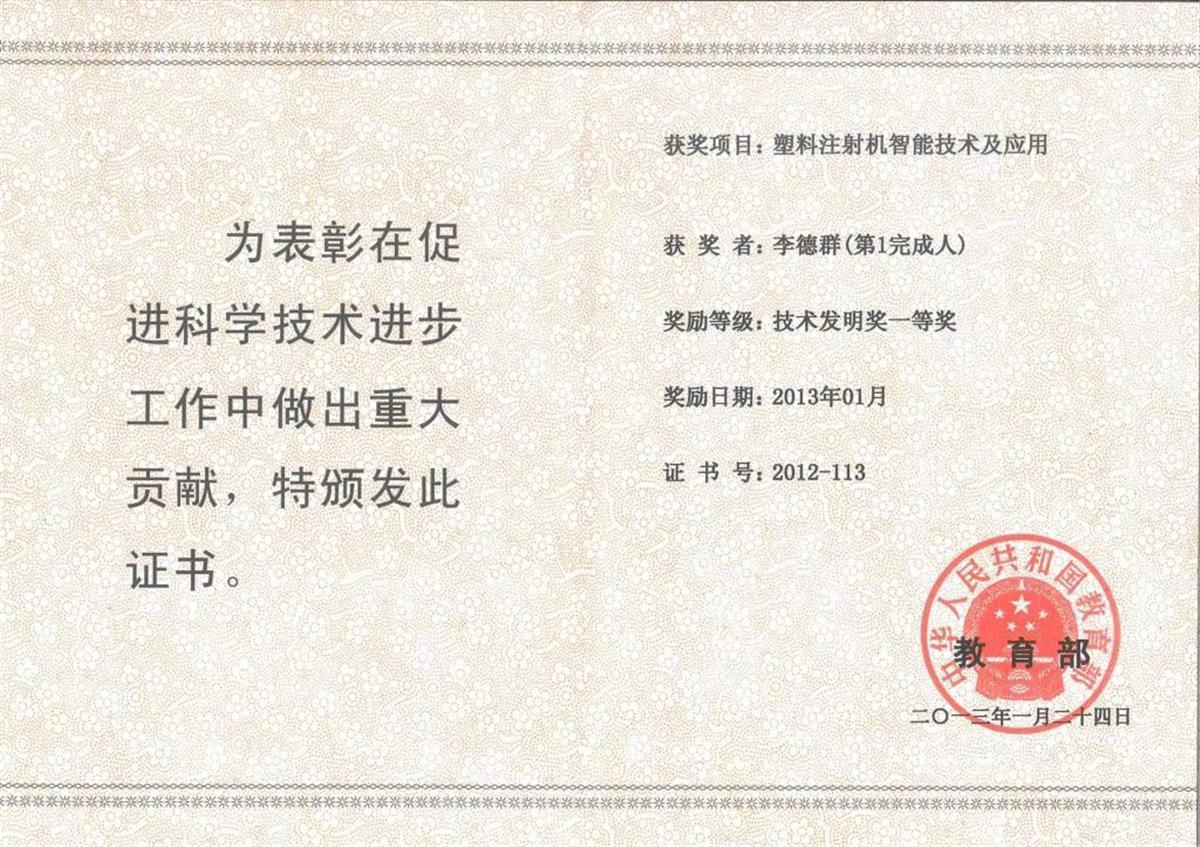 2012年塑料注射机智能技术及应用成果获教育部技术发明一等奖