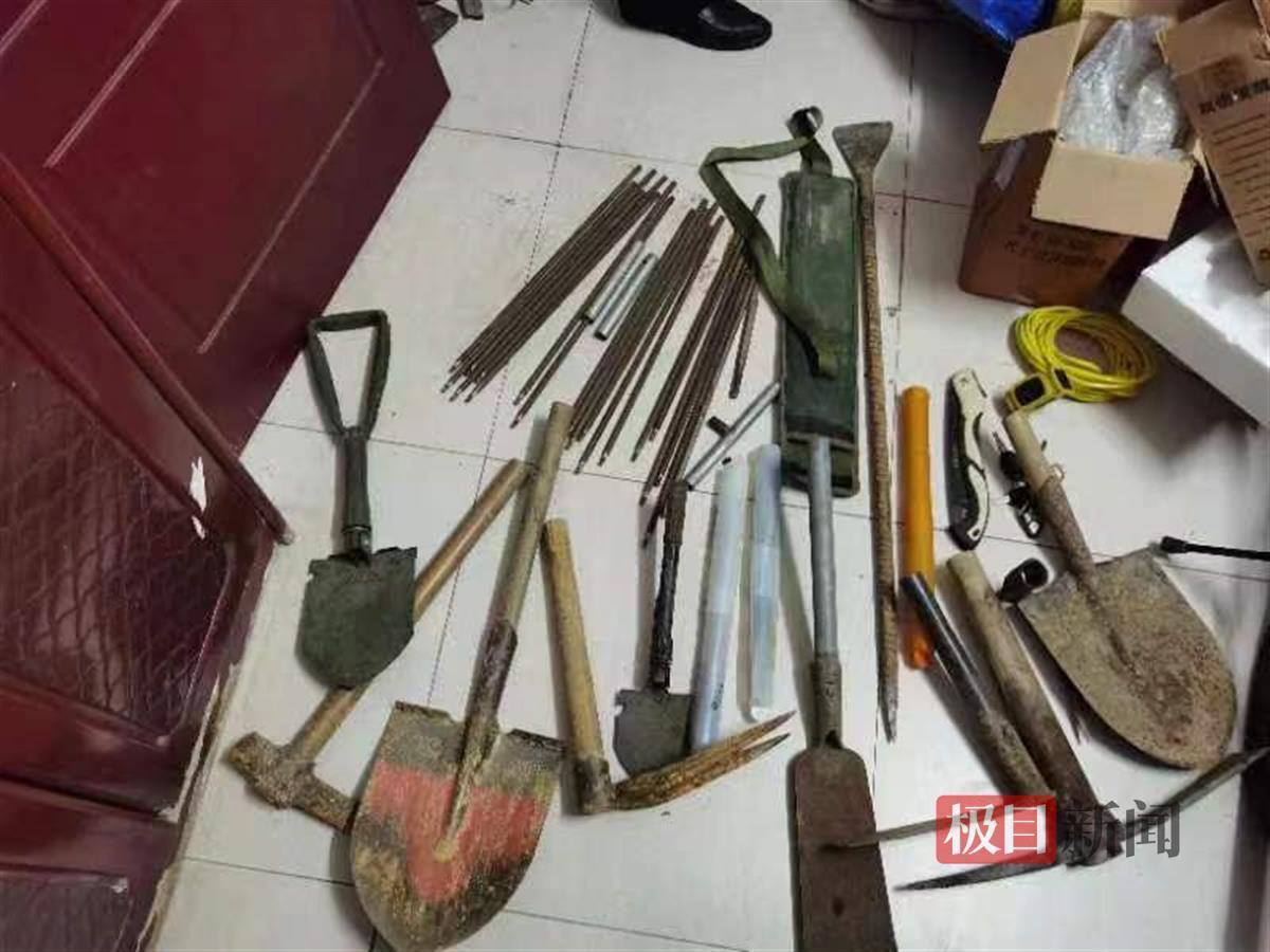 接警后,蕲州派出所联合刑侦大队成立专班开展侦查。6月14日晚,专班民警将蕲州籍犯罪嫌疑人张某抓获。侦查民警根据张某交代的线索,深入研判、调查走访,于次日下午在蕲州抓获同案犯罪嫌疑人刘某元(男,江苏籍)。根据刘某元的供述,掌握了又一名同伙郭某的信息。当晚,民警在武穴市青林社区附近抓获犯罪嫌疑人郭某(男,武穴籍,曾在陕西某地盗墓被公安机关处罚),并在其家中发现了用来盗掘古墓的铲子、探测器等专业盗墓工具若干。