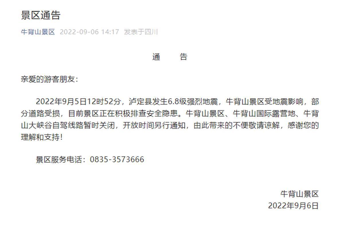 此外,四川雅安牛背山景区也于6日发布通告称,牛背山景区受地震影响,部分道路受损,目前景区正在积极排查安全隐患。牛背山景区、牛背山国际露营地、牛背山大峡谷自驾线路暂时关闭,开放时间另行通知。
