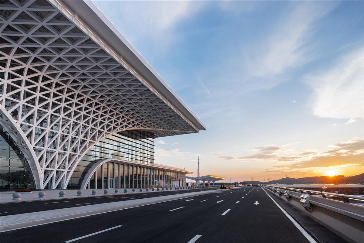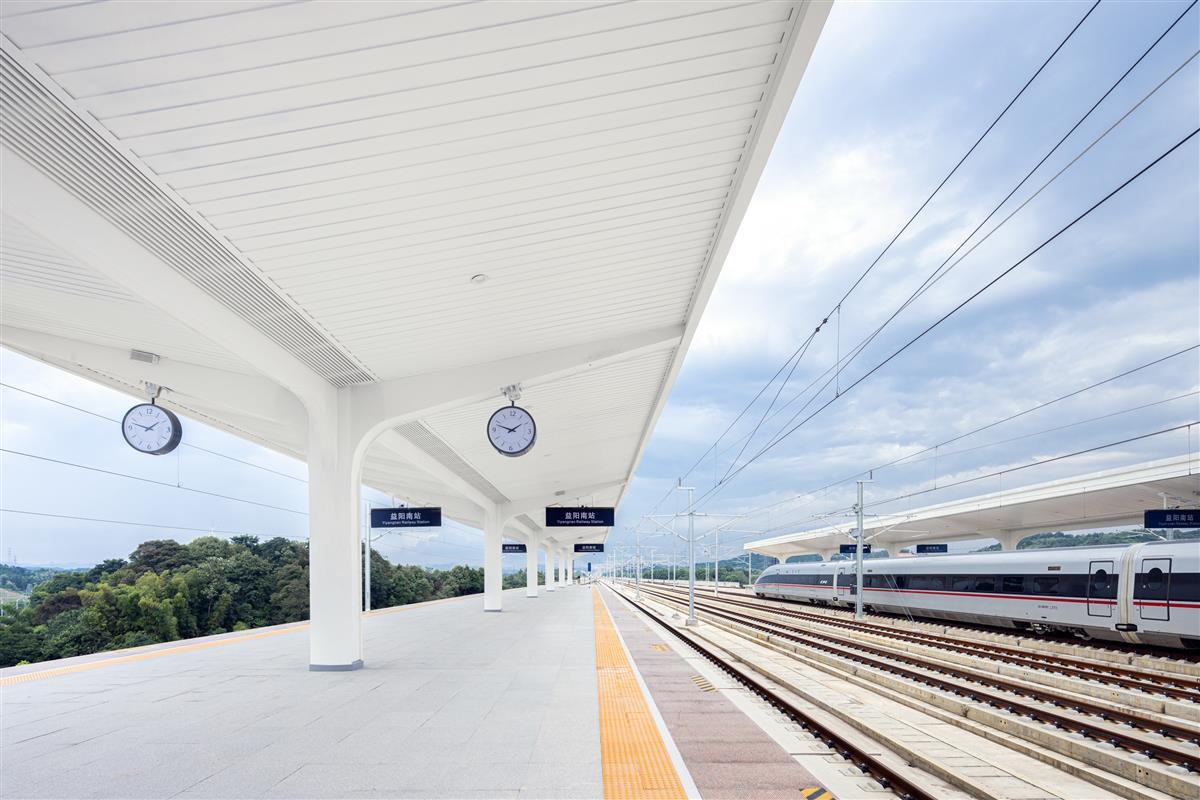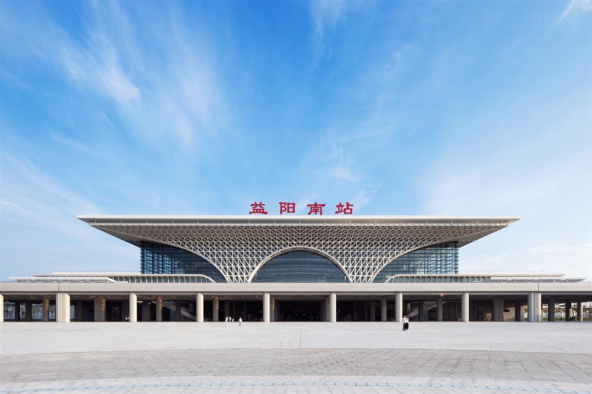 环保也是一大亮点。在全线规模最大的车站益阳站设计中,设计团队充分结合当地“竹文化”,提取竹文化的三角交织元素,通过空间编织钢结构支撑,让整个车站跨度更大、空间更灵动。设计团队还巧妙地将圆拱造型与纤细的索拉式玻璃幕墙相结合,勾勒出带有山体弧度的取景画框,让美景成为站厅四季变化的背景墙。