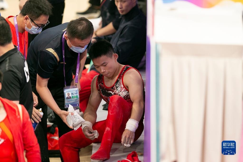 9月6日,杨皓楠(右一)在比赛中受伤后接受治疗。新华社记者 许雅楠 摄