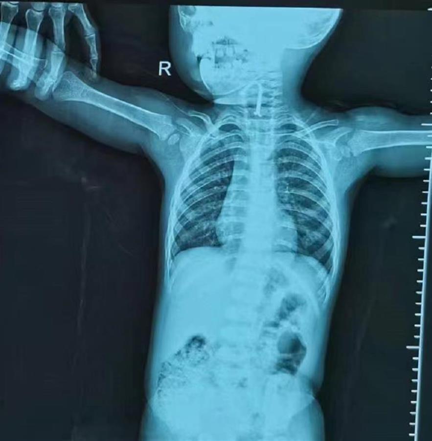家住仙桃的小星年底要满2岁了。几天前,妈妈因事抽不开身,让五岁的姐姐带着弟弟小星玩。没多久,妈妈发现小星半张着嘴,口中不停流涎,还有干呕症状。妈妈察觉挂在客厅墙上的识字挂图掉在地上,挂钩只剩下了塑料部分,L型铁丝不见了。妈妈怀疑孩子把铁丝吃进去了,赶紧带他到当地医院就诊。检查发现,喉部有一个钩子样的金属异物,当地医院考虑到孩子小、手术风险高,将小星转诊到武汉儿童医院。