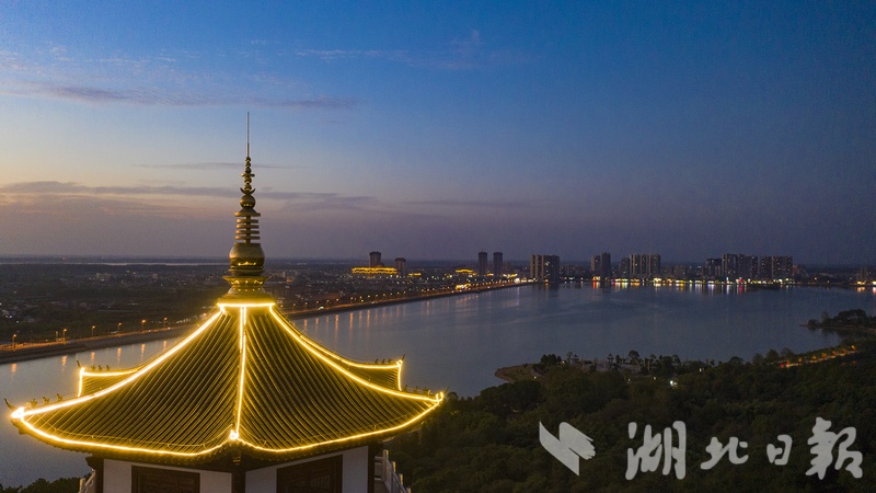 湖北日报客户端讯(嘉鱼频道记者雷平)9月6日19时,嘉鱼县牛头山上新建的岳公楼流光溢彩,近600米长的景观灯装扮着古色古香的楼宇。三湖连江景观带如诗如画,岳公楼犹如画龙点睛,赫然又添上了浓墨重彩的一笔。
