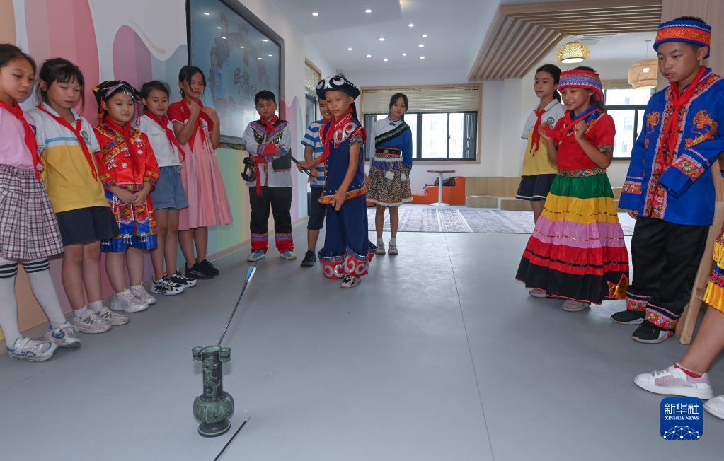 9月7日,多个民族的孩子们在东林镇星火村参加趣味投壶活动。