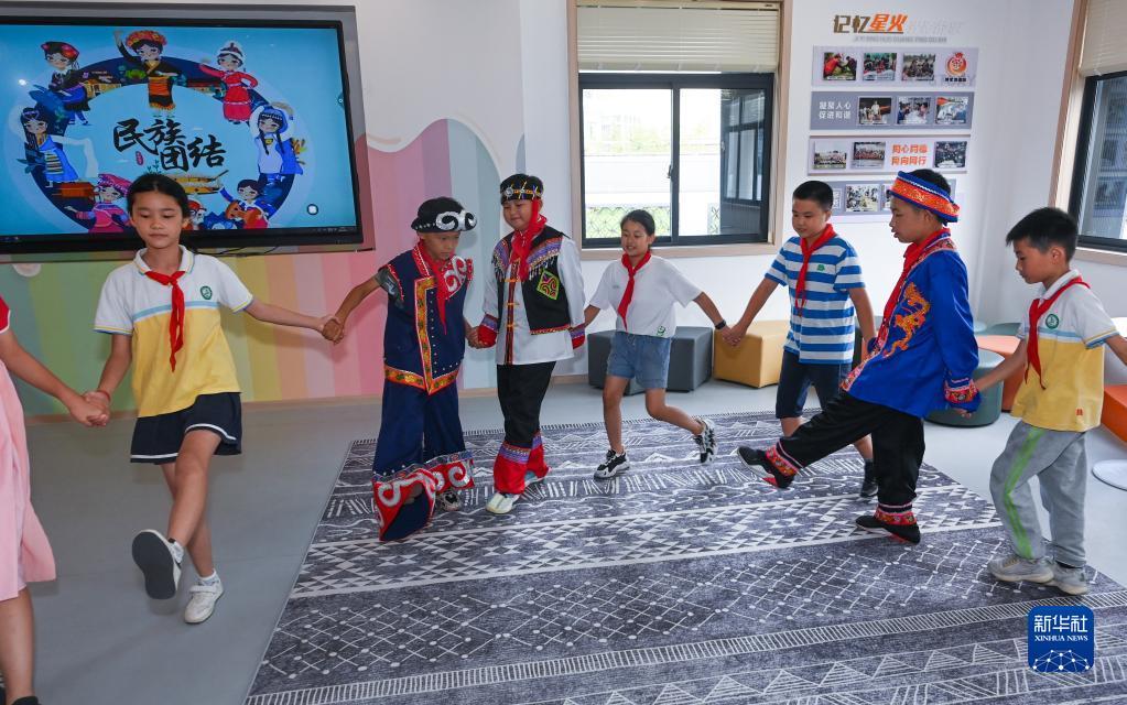 9月7日,多个民族的孩子们在东林镇星火村参加迎中秋集体舞。