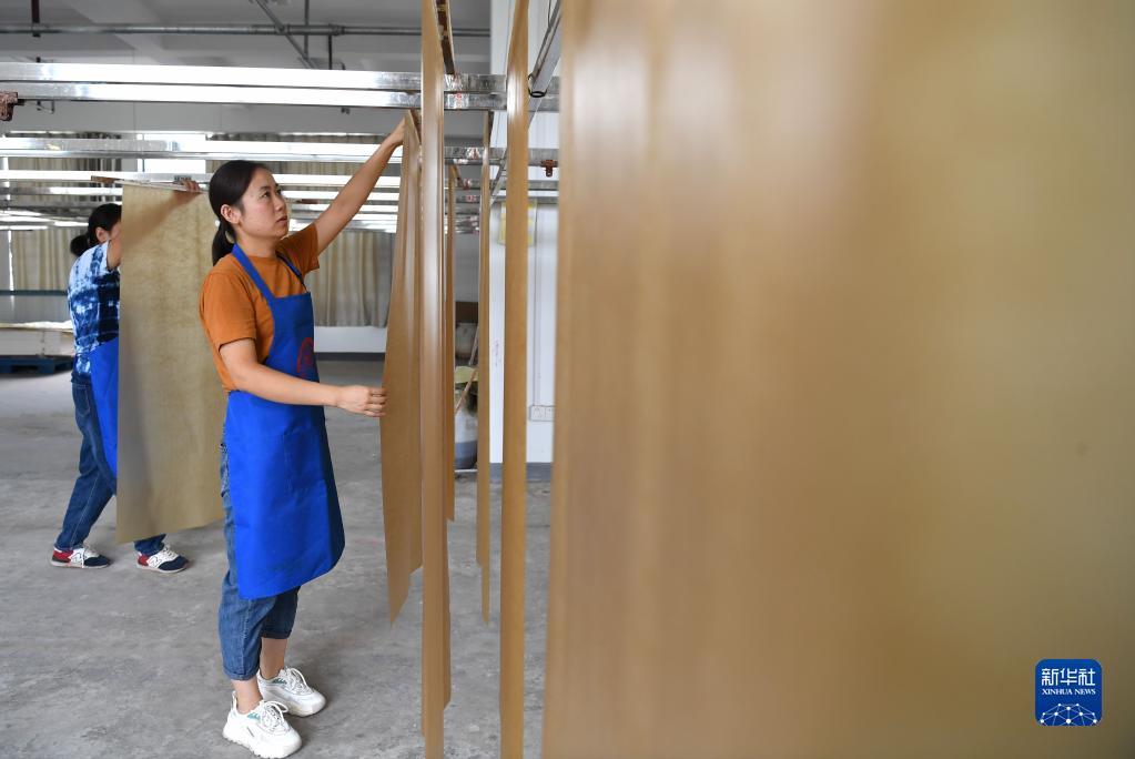 9月8日,在纸笺加工技艺传习基地,工人在进行纸笺加工的提挂工序。