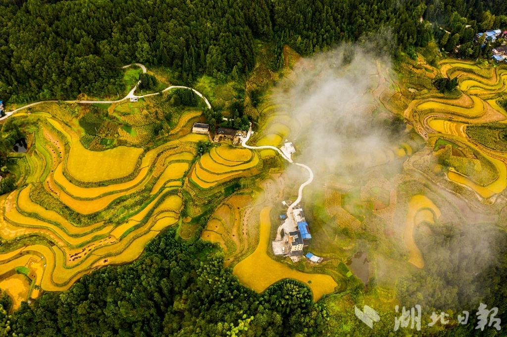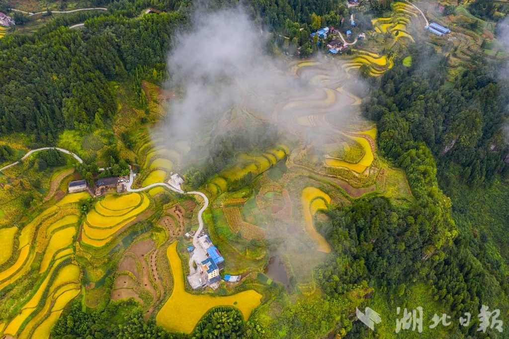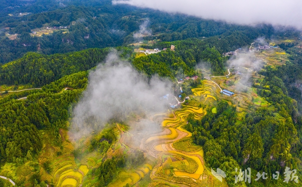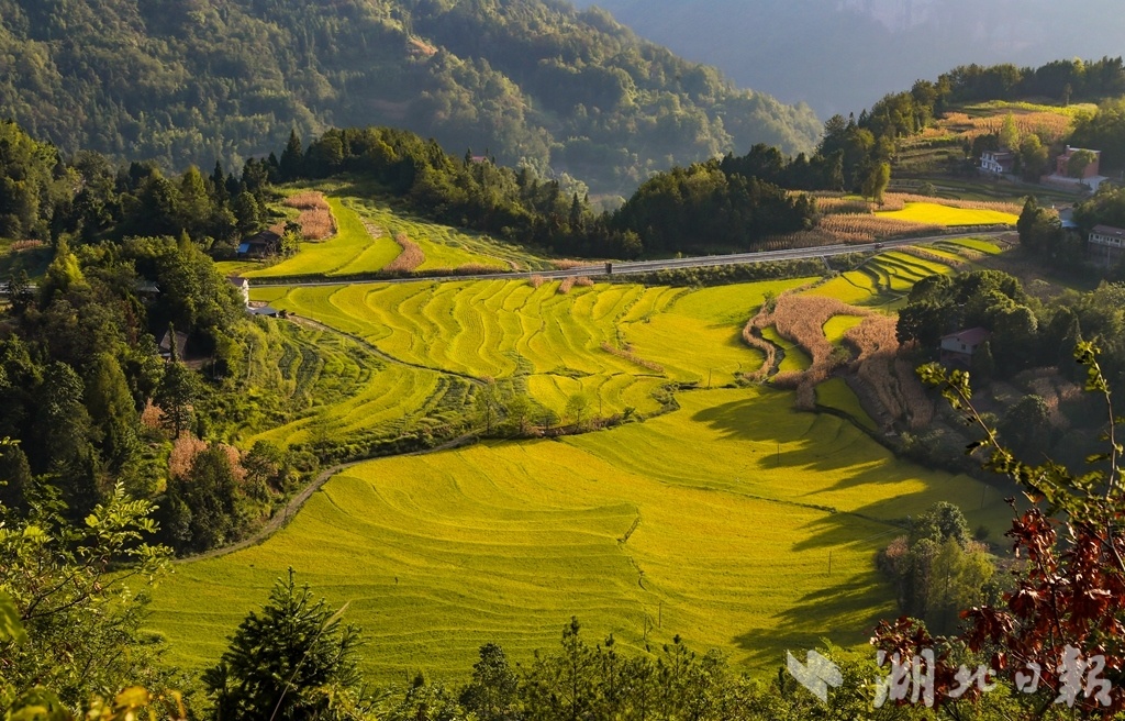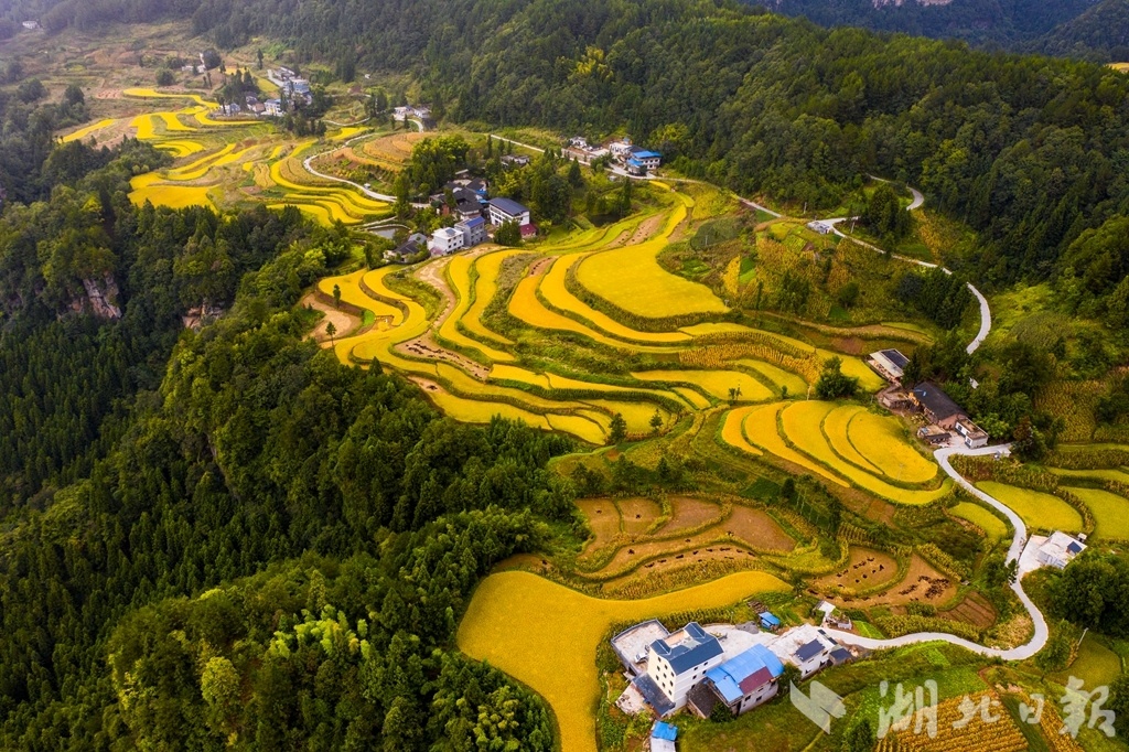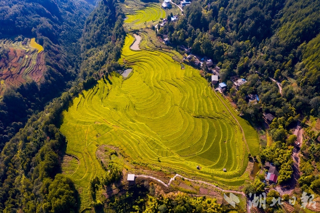 湖北日报客户端(利川频道 通讯员 李传书 杨翠)利川的梯田秋色很美丽,弯弯的梯田象无数个月牙儿排在山坡上,田里的稻子金黄金黄的,秋风吹起的时候,掀起层层稻浪,前面的浪头没跑远,后面的稻浪又追了上来,后浪赶前浪,一层又一层,最后连成了一片金色的海洋,多美呀!这些梯田一层一层的又象登天的梯子 ,秋天这梯子铺上了金色的地毯,沿着这梯子一层一层的上去,你就会到达那高高的山顶,然后产生出丰收满满的感觉;还有一些梯田象指纹,一圈一圈的在山间,在悬崖上,秋天金灿灿的,抢人眼球,让人遐想莫不是神仙的杰作?有的梯田像彩绘的西南卡普,有的像五彩的调色盘,有的像……