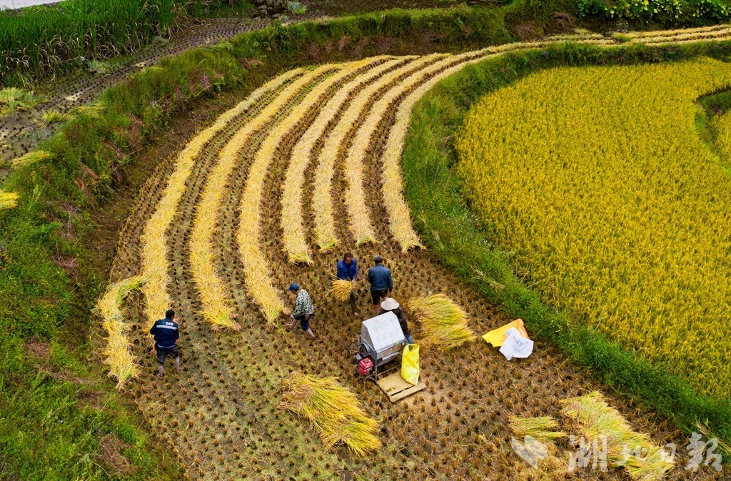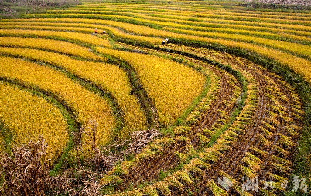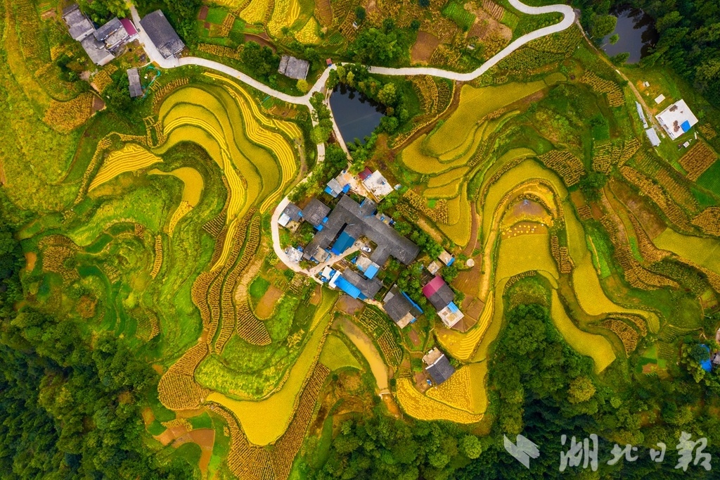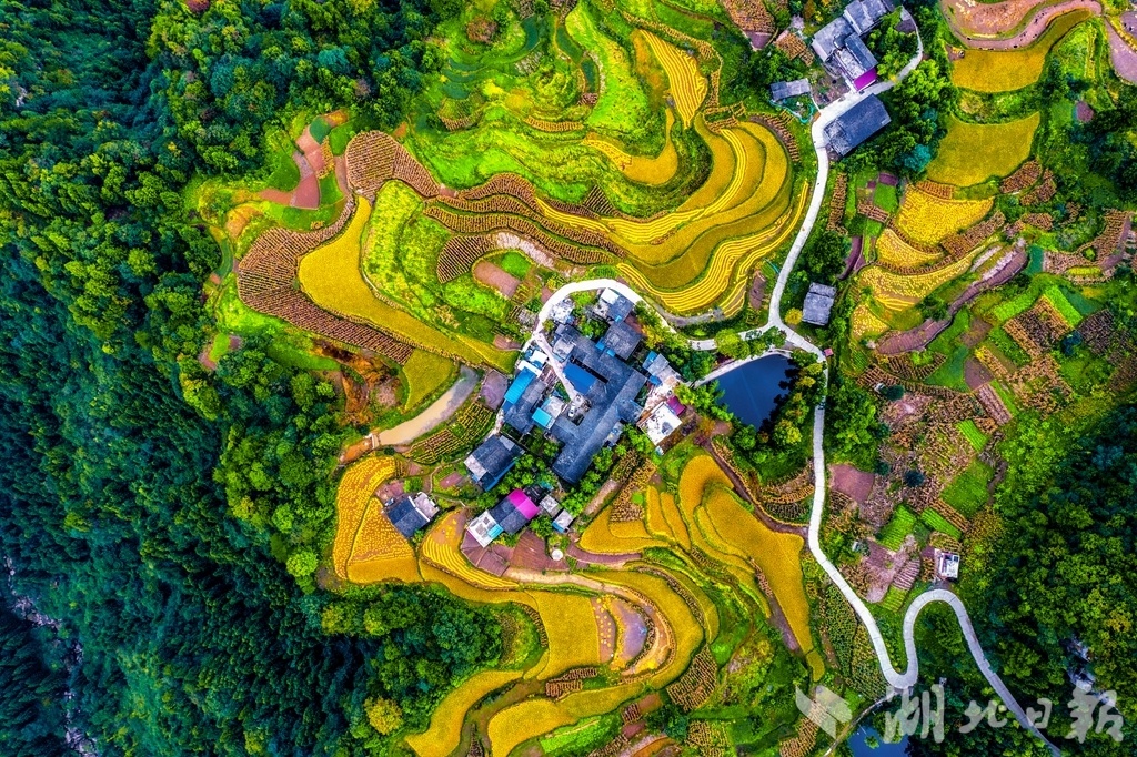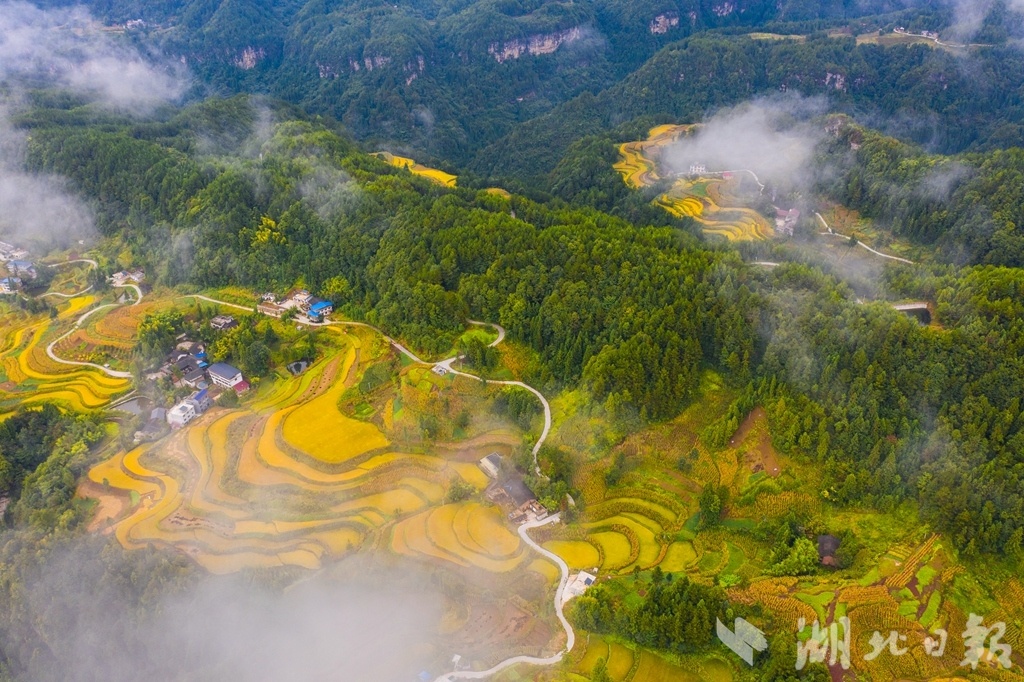 湖北日报客户端(利川频道 通讯员 李传书 杨翠)利川的梯田秋色很美丽,弯弯的梯田象无数个月牙儿排在山坡上,田里的稻子金黄金黄的,秋风吹起的时候,掀起层层稻浪,前面的浪头没跑远,后面的稻浪又追了上来,后浪赶前浪,一层又一层,最后连成了一片金色的海洋,多美呀!这些梯田一层一层的又象登天的梯子 ,秋天这梯子铺上了金色的地毯,沿着这梯子一层一层的上去,你就会到达那高高的山顶,然后产生出丰收满满的感觉;还有一些梯田象指纹,一圈一圈的在山间,在悬崖上,秋天金灿灿的,抢人眼球,让人遐想莫不是神仙的杰作?有的梯田像彩绘的西南卡普,有的像五彩的调色盘,有的像……