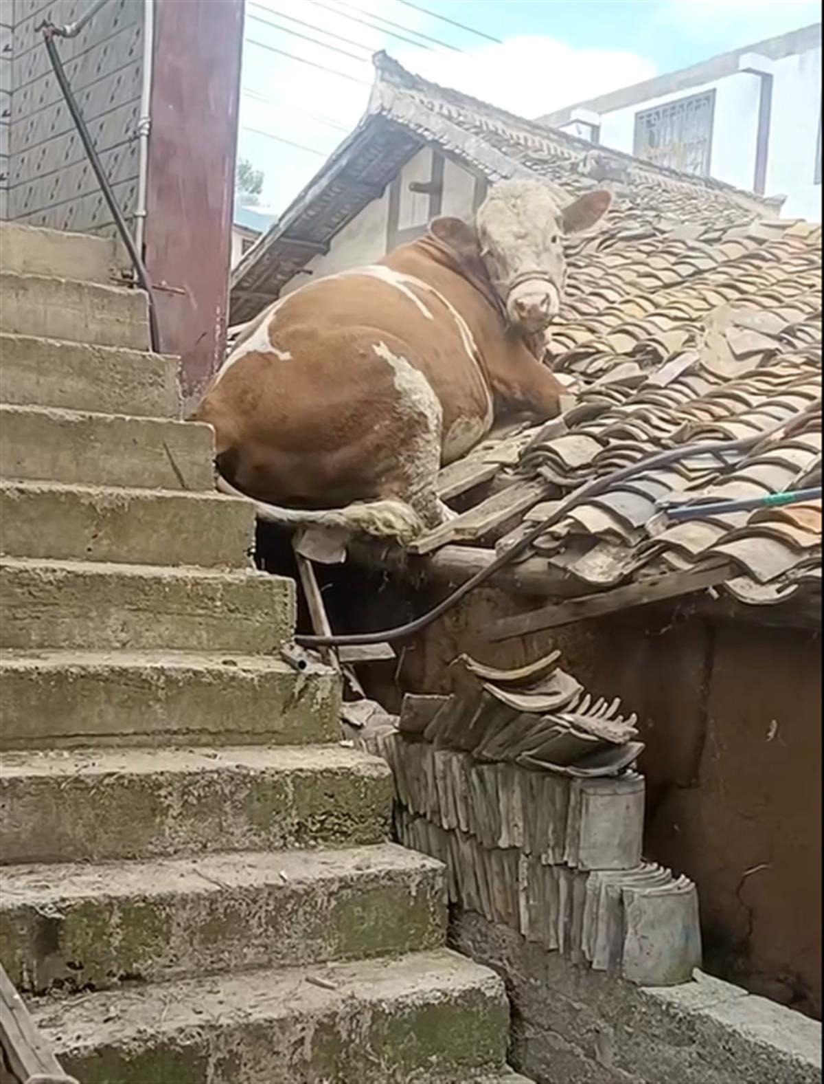 黄牛爬上屋顶(视频截图)