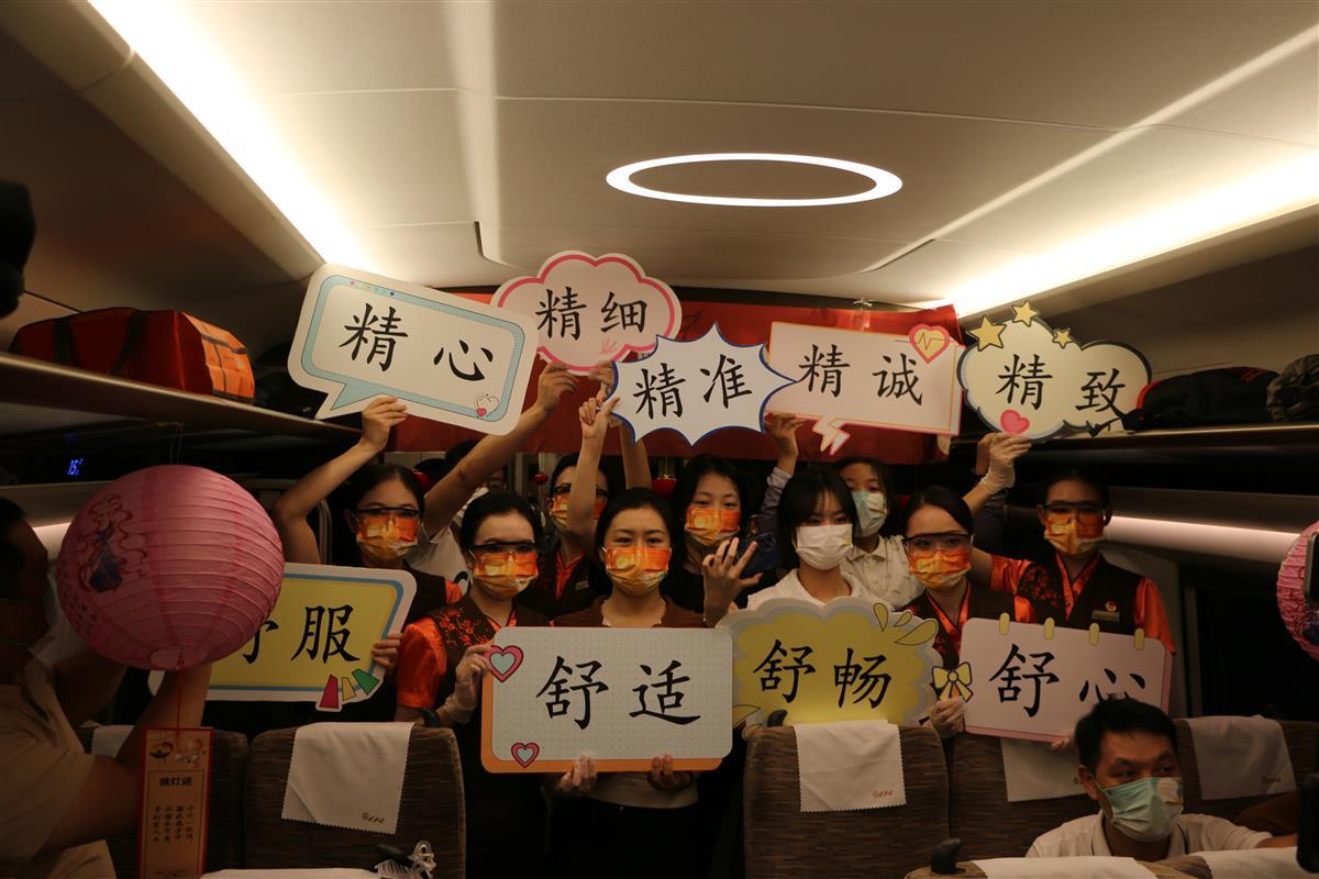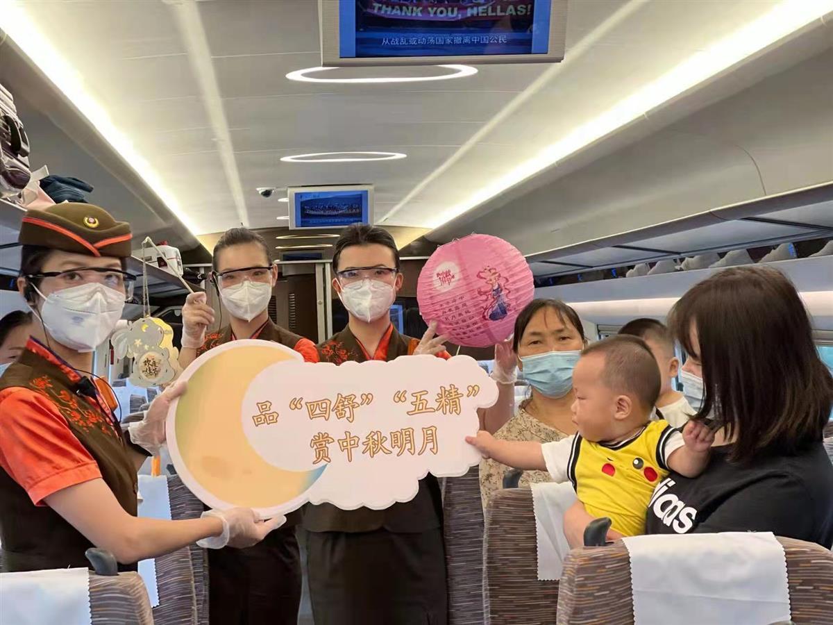 襄阳客运段“龙韵骧梦”列车乘务组携手襄阳铁路公安处,既开展乘车安全、防范电信诈骗、疫情防控等灯谜有奖竞猜,又讲解中秋佳节赏月、吃月饼、猜灯谜等传统习俗来历,还为旅客送上丰富多彩的做灯笼、写贺卡等节目大餐,让大家在高铁上“沉浸式”感受传统文化魅力。