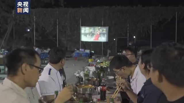中秋节当天,为了让员工们能够度过一个愉快的节日,施工单位也是早早做了安排。工作结束后,中方员工欢聚在工地上,一边吃饭、品尝月饼,一边看中央广播电视总台中秋晚会,现场一片其乐融融。