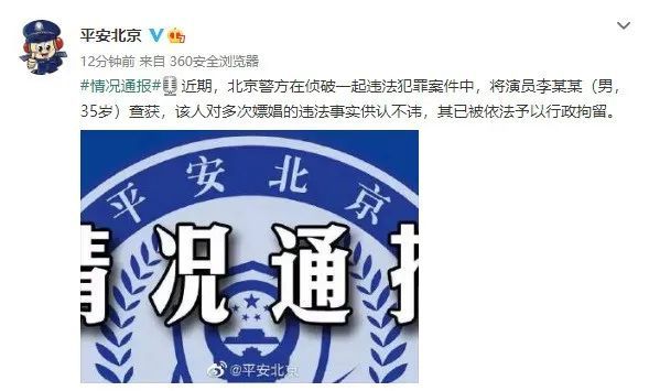 9月11日,“平安北京”发布情况通报称,近期,北京警方在侦破一起违法犯罪案件中,将演员李某某(男,35岁)查获,该人对多次嫖娼的违法事实供认不讳,其已被依法予以行政拘留。