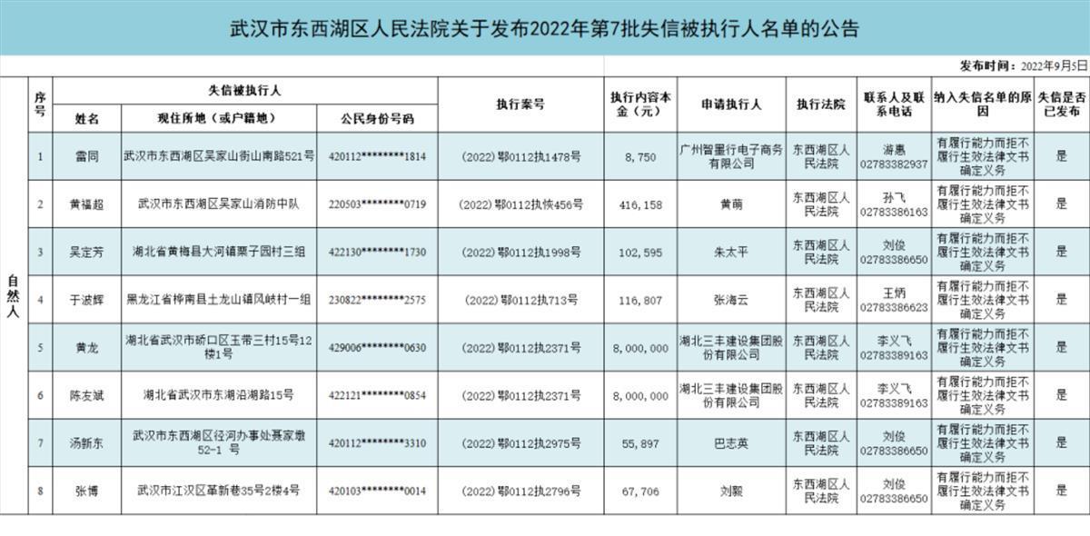 极目新闻记者9月11日获悉,武汉市东西湖区委文明办、武汉市东西湖区人民法院联合公布今年第7批失信被执行人名单,涉案8件,标的金额1676万余元,上榜者8名。东西湖区法院表示,将继续坚持公正、规范、高效执行,强化善意文明执行理念,继续加大执行力度,加大失信惩戒力度,同时注重公正保护双方当事人的合法权益,为营造良好营商环境提供法治保障。