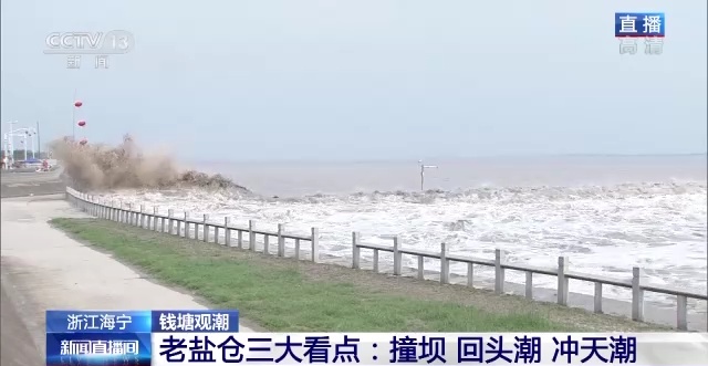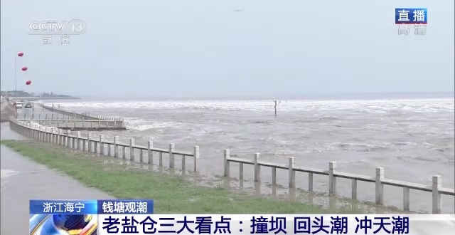 总台记者 李欣蔓:老盐仓观潮点有三大看点,潮水撞坝、回头潮、冲天潮。回头潮朝着它来时的方向奔涌而去。在距离大坝下游600多米的位置,就有一个小拐角,那里即将出现冲天潮。岸边挂有红灯笼的位置就是即将出现冲天潮的地方。就在回头潮被挡住的那一刹那,它毫不犹豫起身飞跃,我们目测它的高度达到了第二个红灯笼的位置,这个红灯笼高出老海塘大概7米。