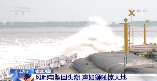 总台记者 李欣蔓:潮水以非常快的速度迅速填满了大拐角,瞬间形成了回头潮,逆流而上的潮水遇到拦河大坝后,以泰山压顶之势翻卷回头。虽然说今天的冲天潮高度和昨天差不多,但是水量似乎大了不少。