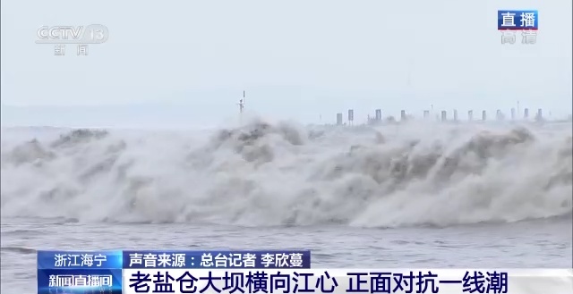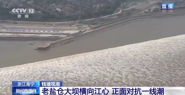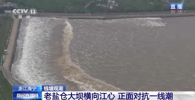 总台记者 李欣蔓:江水在老盐仓这里成了一个90度的大拐弯,为了围垦和保护海塘的需要,这里建起了老盐仓大坝。江中心的潮水率先撞上了大坝的顶端,我们看到每一股潮水都在试图翻越坝体。