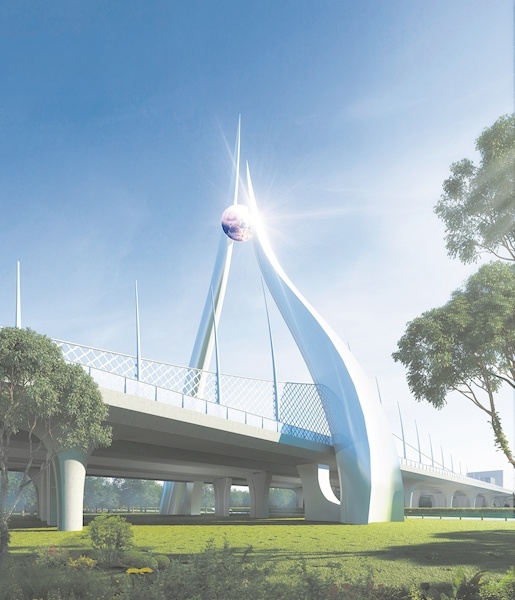 亮化也将是该段桥梁的一大亮点。据介绍,后期在光谷之珠高塔两侧,将结合防抛网的设计,通过具有韵律感、柔性线条的太阳能灯柱,收集阳光,夜间汇聚于光谷之珠顶端的透明灯球之上,形成众星捧月的氛围感。同时,作为进入东湖科学城空间序列的序曲,其将通过框景和异步异景的手法,从线性空间上,为来访者塑造时空转换的心理感受,与科创门交相辉映。