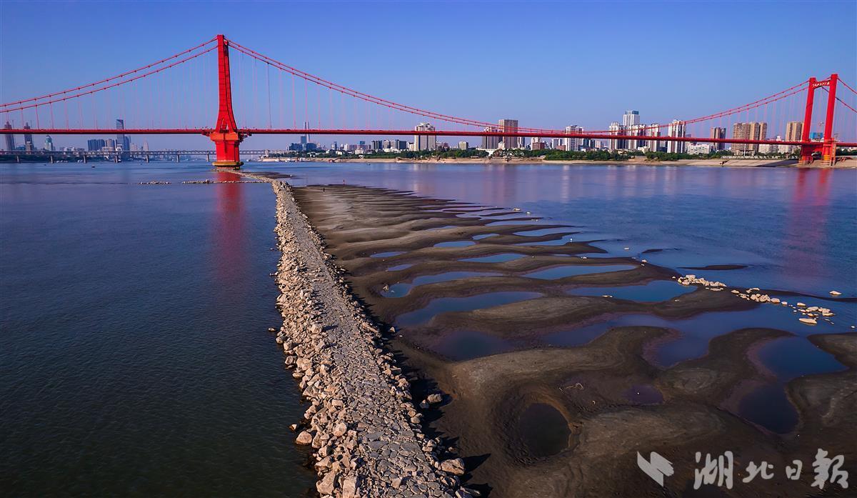 据了解,这条丁字坝是航道的整治建筑在修建鹦鹉洲大桥时所建,因该处附近江面较宽,为了让江水集中利于行船,所以修建了丁字坝整治航道,优化长江水道航运环境。往常丁字坝在冬季枯水期才会显露出来,今年在8月份就见到它实属少见。(湖北日报全媒记者 朱熙勇 摄)