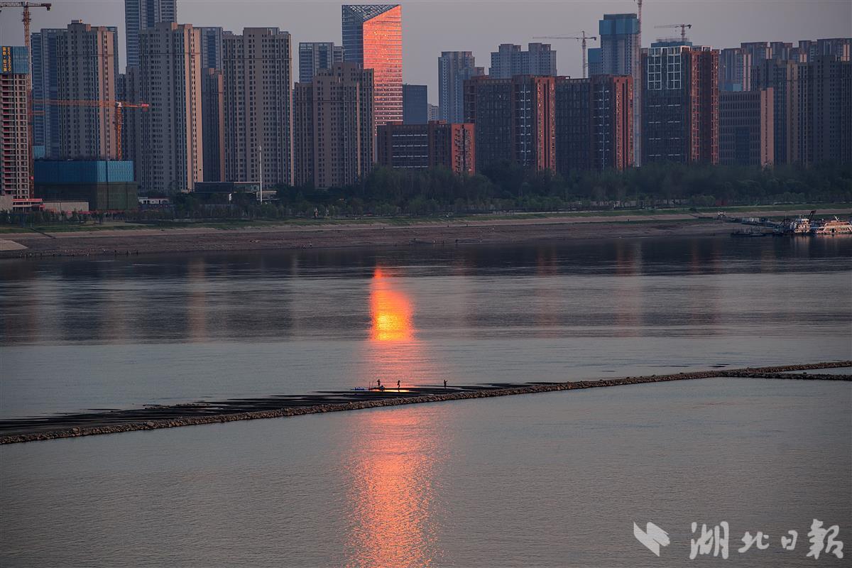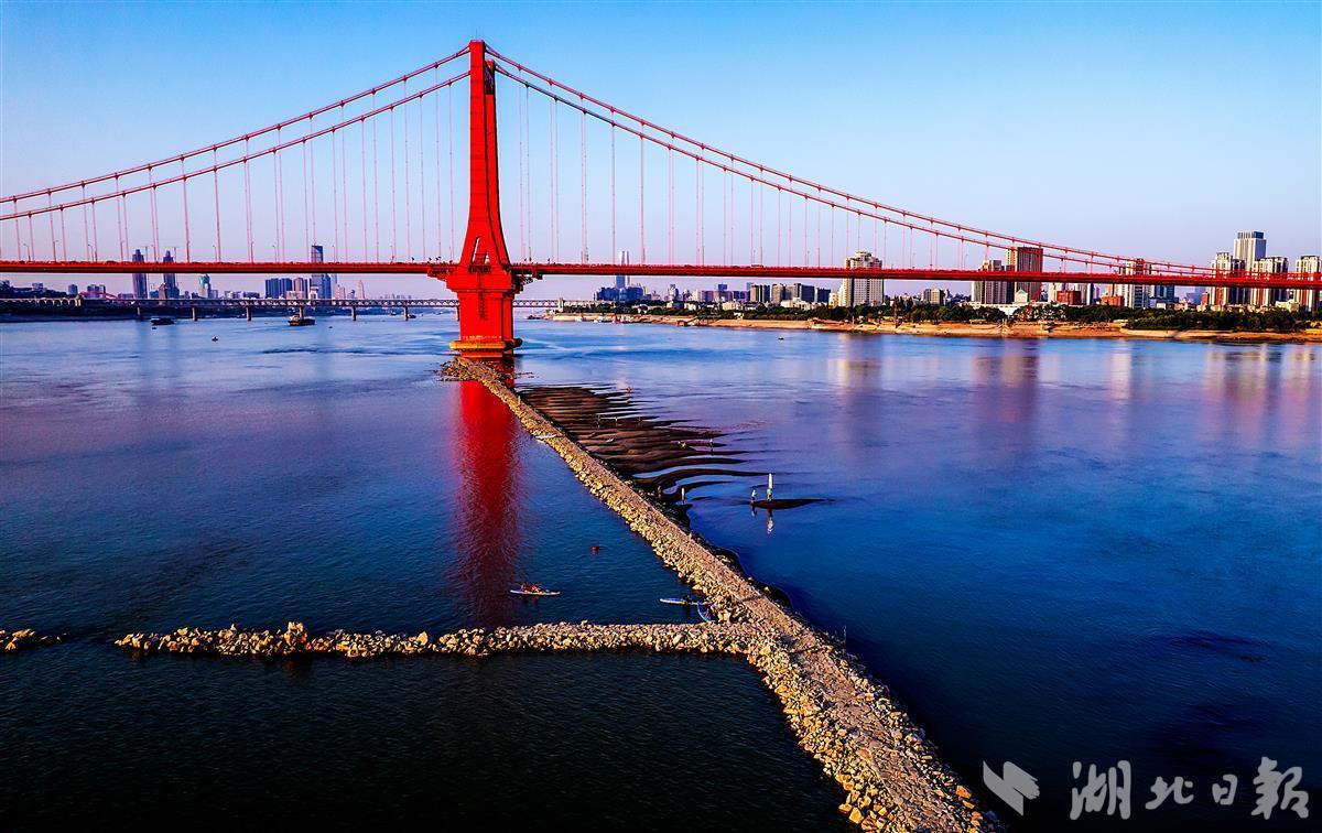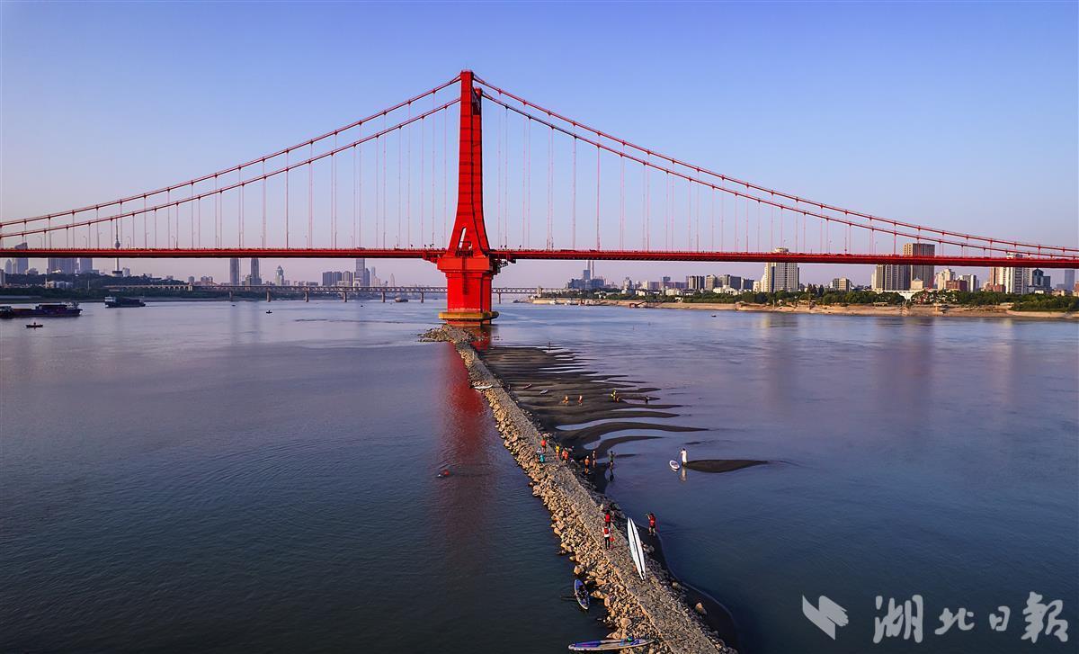 9月5日,夕阳西下,鹦鹉洲长江大桥上便聚集了许多前来观赏长江江心小路的游人。近日,鹦鹉洲长江大桥2号主塔江面上,显露出来一条丁字形的小路和大片沙洲,吸引许多游人来打卡。