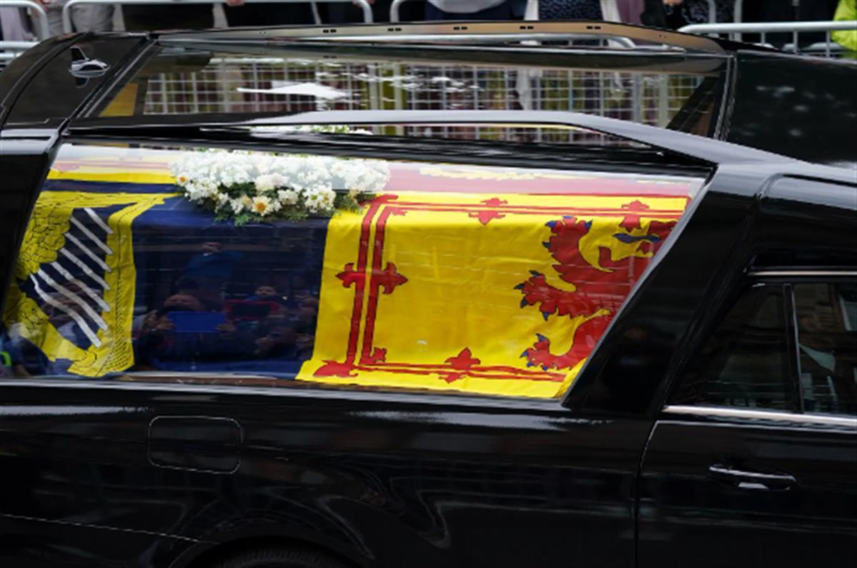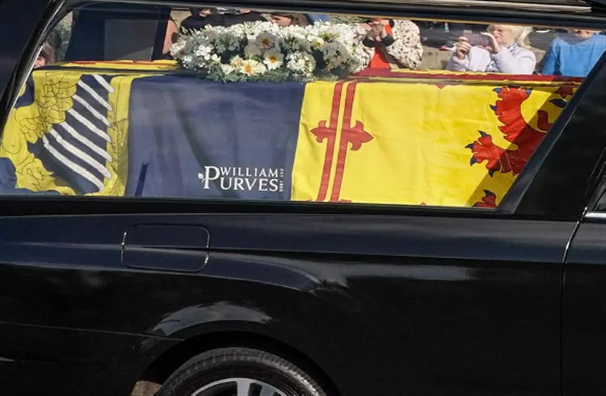 当灵车抵达荷里路德宫时,侧窗上的广告标签已经被移除。