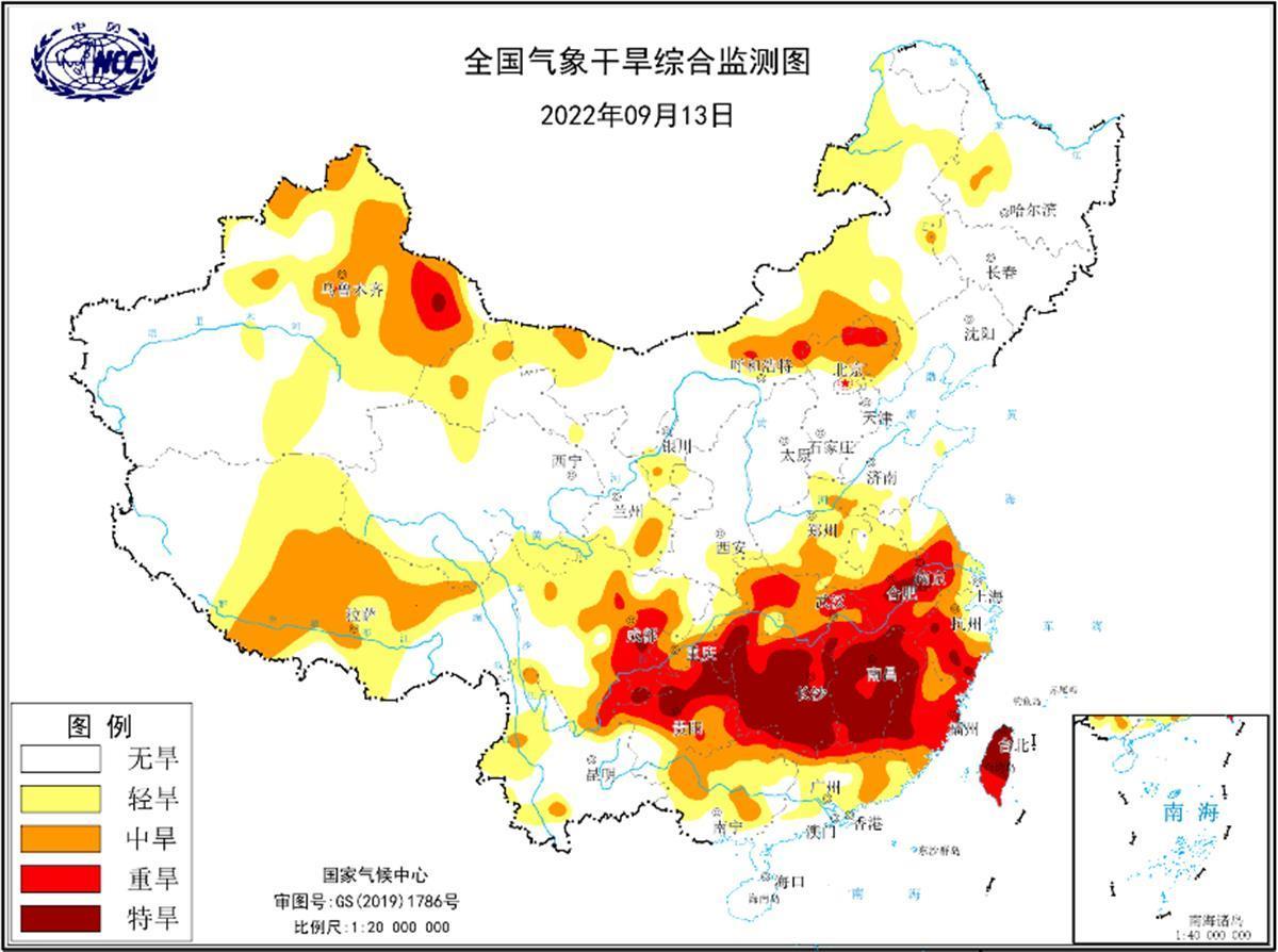 中央气象台9月13日18时继续发布气象干旱黄色预警:江苏南部、湖北大部等等多地地存在中度至重度气象干旱。