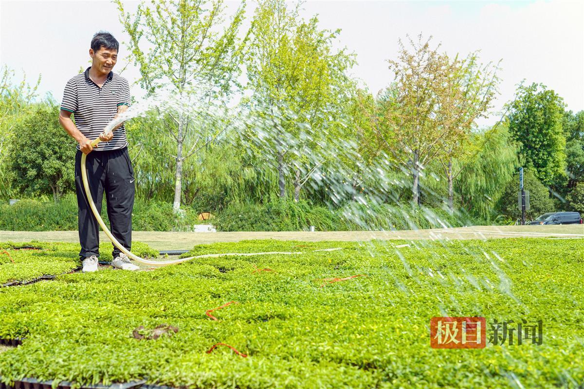 东湖绿道上,园林师傅给苗木浇水