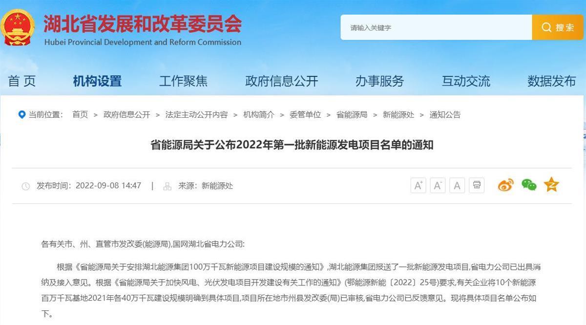 此次公布的风电和光伏发电项目共计32个,容量499.3万千瓦。其中风电项目3个、容量30万千瓦,光伏发电项目29个、容量469.3万千瓦。此次公布的新能源百万千瓦基地项目应在2023年底前全容量并网发电,湖北能源集团100万千瓦新能源项目应在2024年底前全容量并网发电。