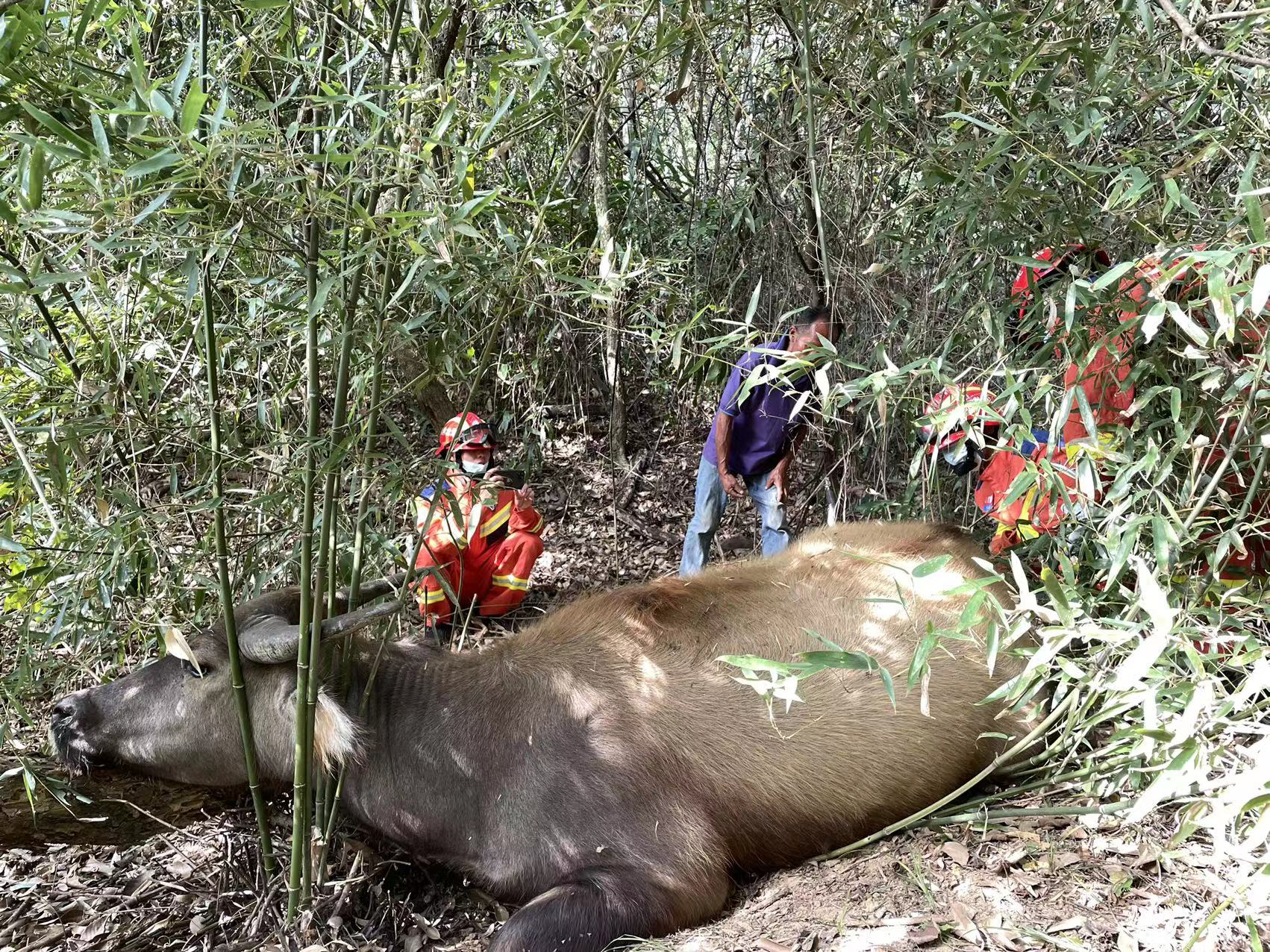 消防救援人员沿着报警人说的路线,穿过小树林到达现场后发现,一头牛的牛蹄被一条钢丝绳牢牢勾住,钢丝绳一头的三角爪正好卡进牛蹄蹄缝内,被卡住钢丝绳的牛被绊倒,无法动弹。消防救援人员判断现场情况后立开展救援工作,一名消防救援人员首先找来一根木棍,将木棍塞进牛蹄蹄缝内,以此木棍作为安全距离,以免牛受到二次伤害,随后消防救援人员用大力剪对准钢丝三角爪连续剪裁,直到剪断钢丝三角爪。经过13分钟的处置,牛被成功救出。