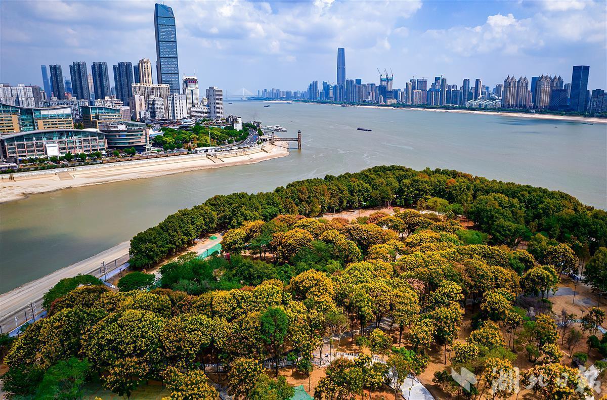 9月14日,鸟瞰秋意渐浓的武汉南岸嘴滨江公园,一棵棵香樟、法桐、构树、栾树等大型乔木遍布园区内,特别是栾树花一簇簇盛放,就像一团团金黄色的火焰。风儿吹过,花儿落下,像下起了一阵金黄细雨。