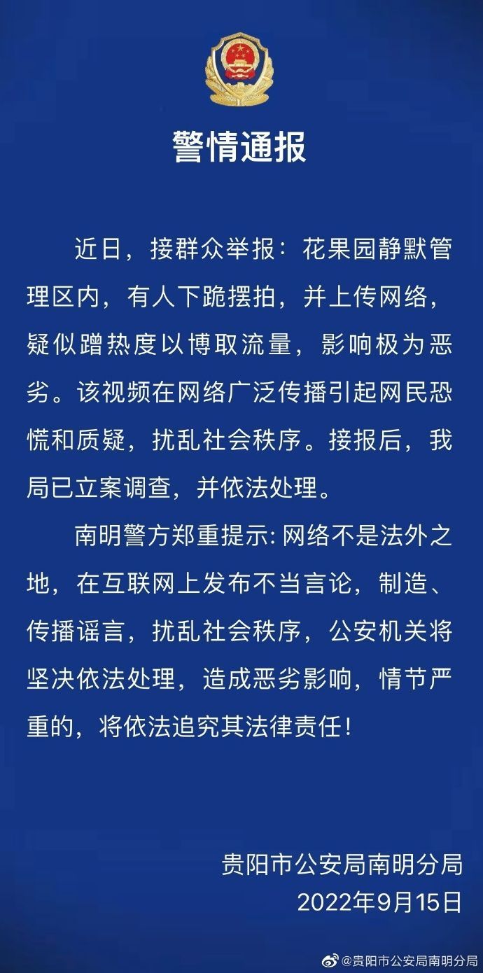 9月15日晚,贵阳市南明区分局发布通报称:接群众举报,有人于静默管理区内下跪摆拍上传网络,疑似蹭热度博取流量,影响极为恶劣。贵阳市南明分局已立案调查,并依法处理。