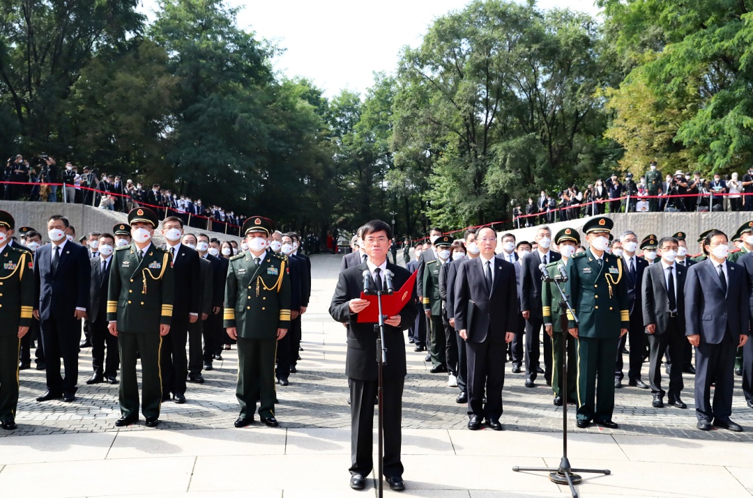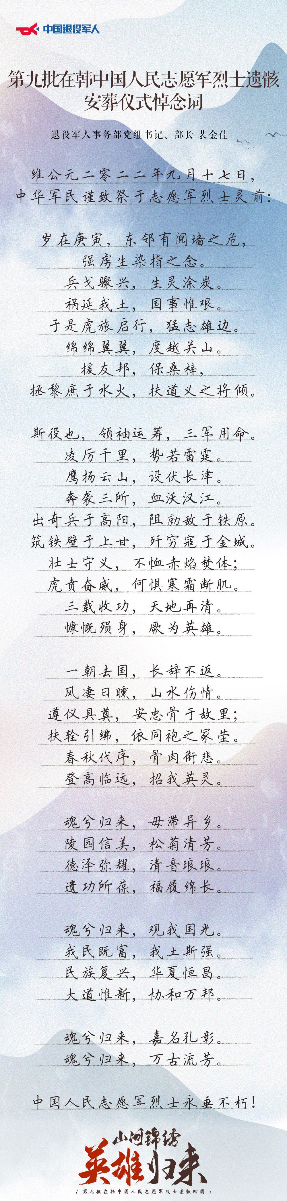 △9月17日上午,第九批在韩中国人民志愿军烈士遗骸安葬仪式在沈阳抗美援朝烈士陵园举行。退役军人事务部党组书记、部长裴金佳出席仪式并致悼念词。
