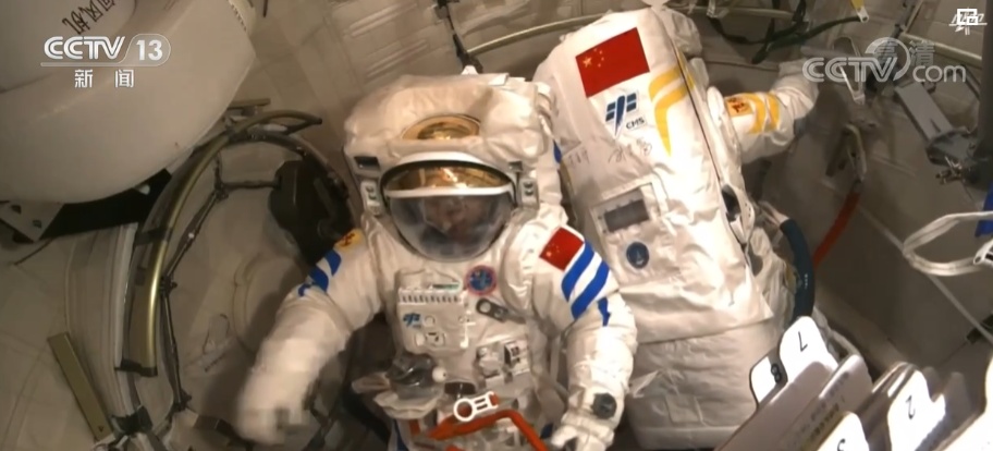中国航天员中心舱外航天服总体主任设计师 廖前芳:我们是在里面给他们装了一个饮水袋,他在操作的过程中,只要低头就能喝到饮料。面罩是通过我们的设计和里面的温湿度控制保证的,他们在出舱之前也会给面窗内部涂一层防雾剂,防止结雾。因为服装没有主动加热的功能,所以在阴影区的时候,他们有时候会觉得稍微偏凉一点,我们做了一个改进,让航天员在阴影区不会觉得太冷。