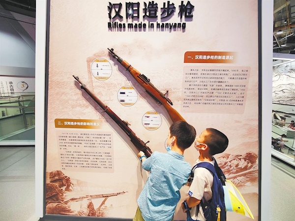 “洋务运动中创办了一批近代军事工业……”“科技瑰宝”展厅内,孩子们抚摸着“汉阳造”步枪,认真聆听讲解。