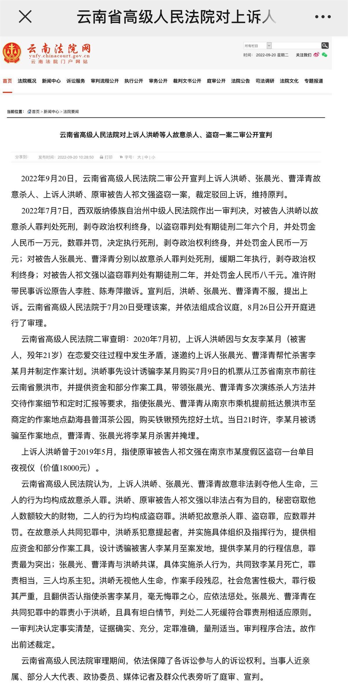 上午10时28分许,云南省高级人民法院二审公开宣判:上诉人洪峤、张晨光、曹泽青故意杀人,上诉人洪峤、原审被告人祁文强盗窃一案,裁定驳回上诉,维持原判。