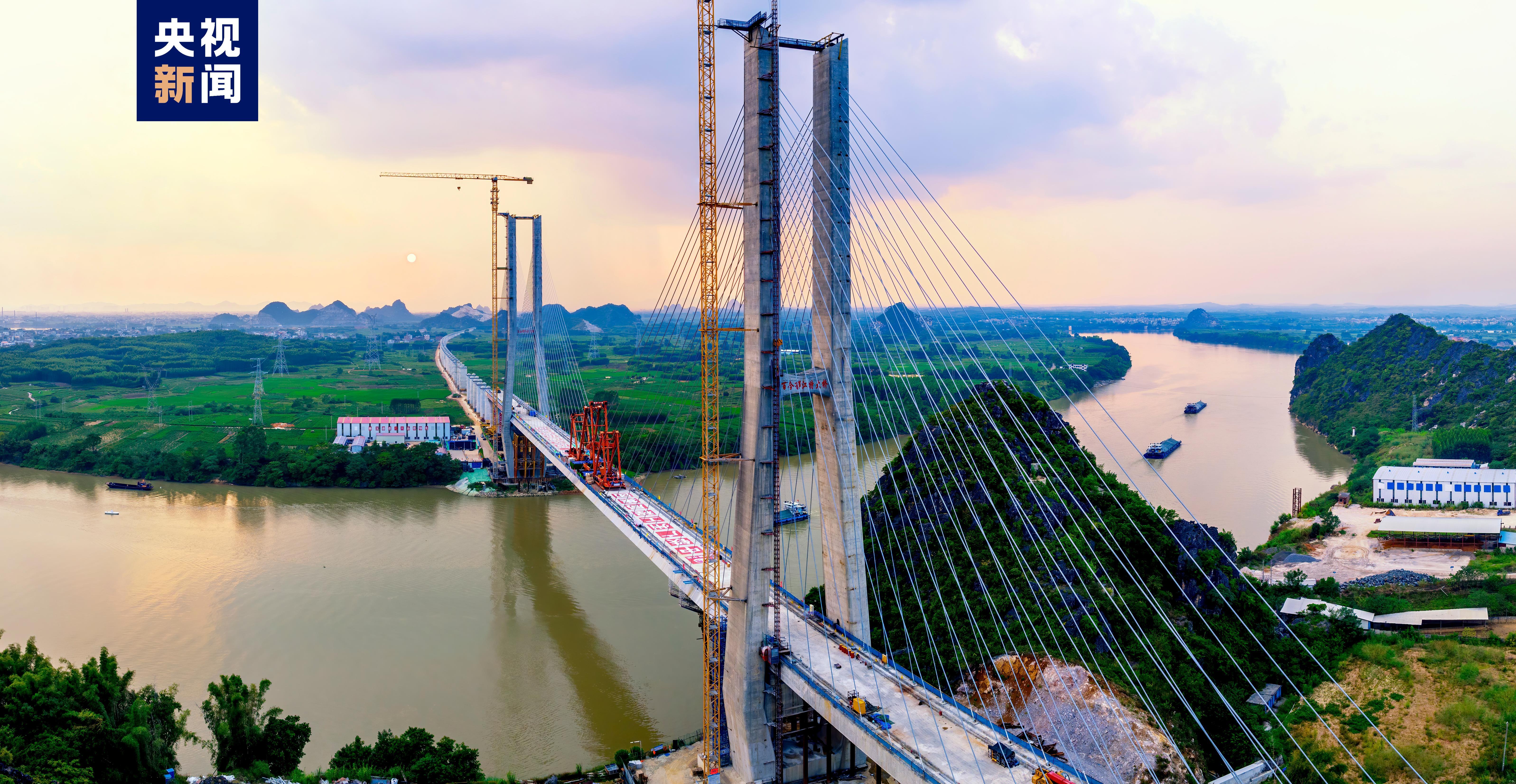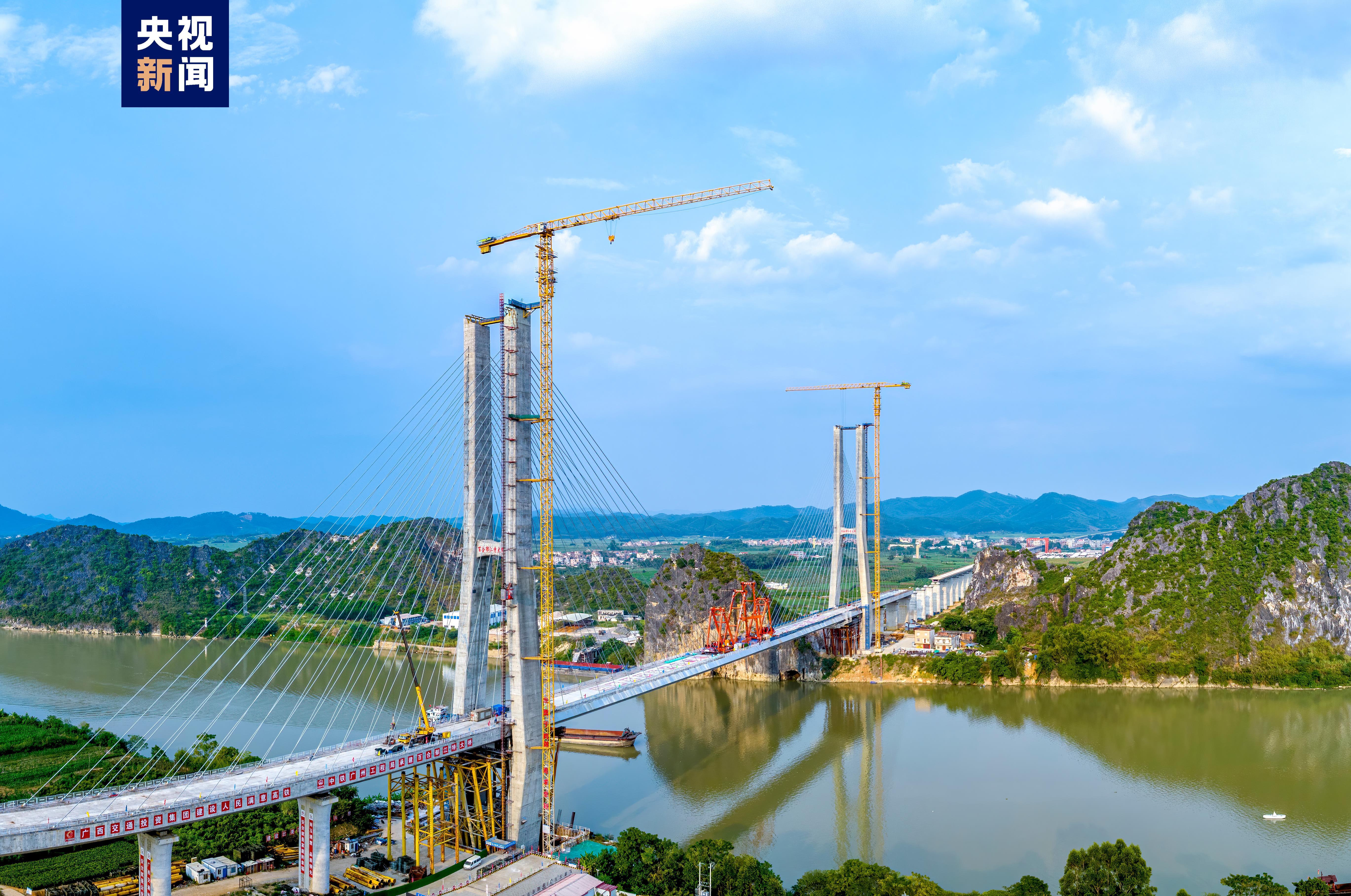 位于广西横州市的百合郁江特大桥主桥是南玉铁路重点控制性工程,主桥为双塔双索面钢-混凝土混合梁斜拉桥,全长612米,主桥设东西两座主塔,塔高146米,相当于48层楼房高度,桥梁主跨330米,为世界同期在建时速350公里无砟轨道高速铁路最大跨径斜拉桥。