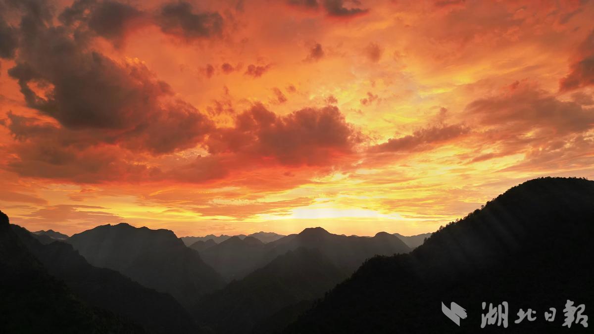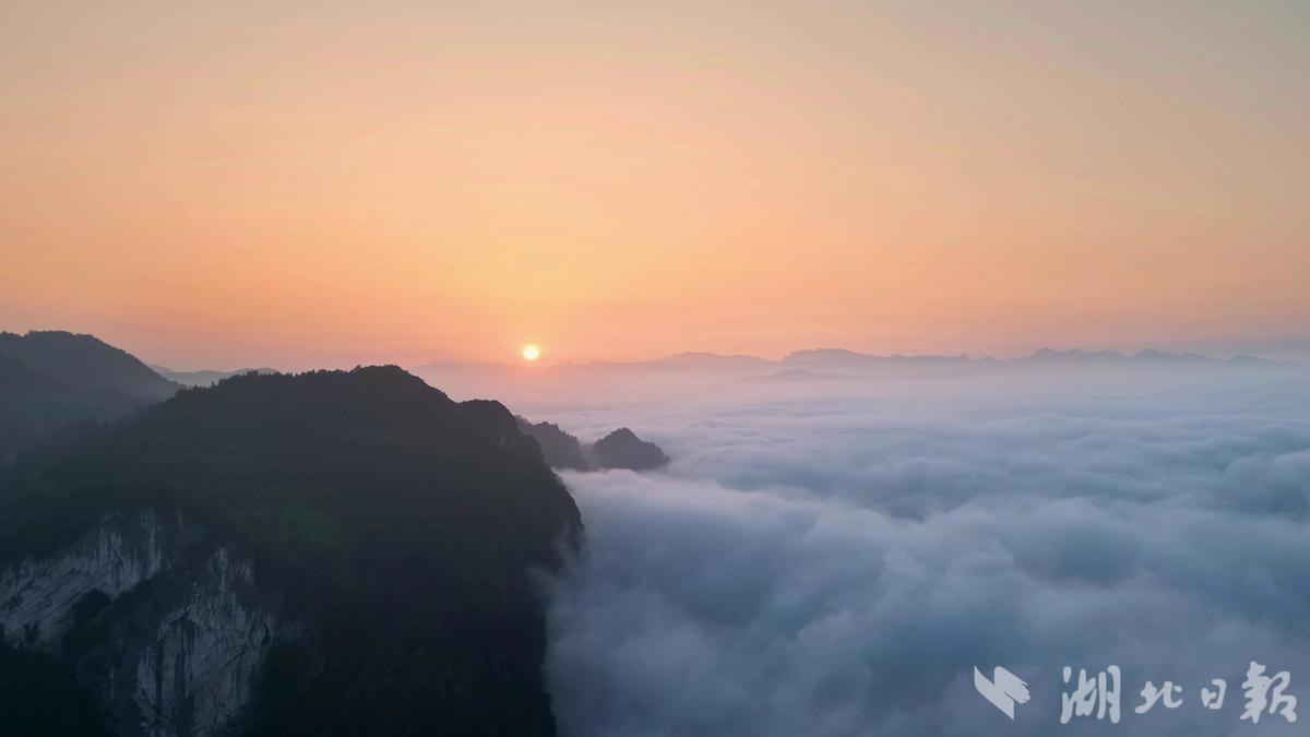 湖北日报客户端讯(鹤峰频道记者陈钰婷 周周 肖琴 摄影 彭文超 向江坤)云海翻涌,太阳渐渐从天边浮起,鹤峰县中营镇二台浸在朝霞里,浩浩云海绕山间。潭暮河秋,悠悠雾霭,芭蕉河山水在逆光下轮廓尽显,美不胜收,犹如一幅幅水墨画。