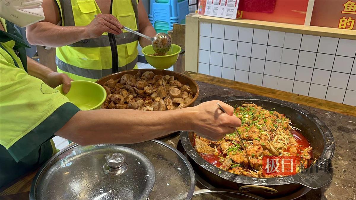 21日,店里准备了红烧鱼、红烧鸡、炒青菜和几盆汤。中午12时许,两名环卫工人到店购买爱心餐,其中一人告诉极目新闻记者,他前一天中午也在这里吃的,饭和菜不限量,吃完可以添,10块钱可以吃得很饱。