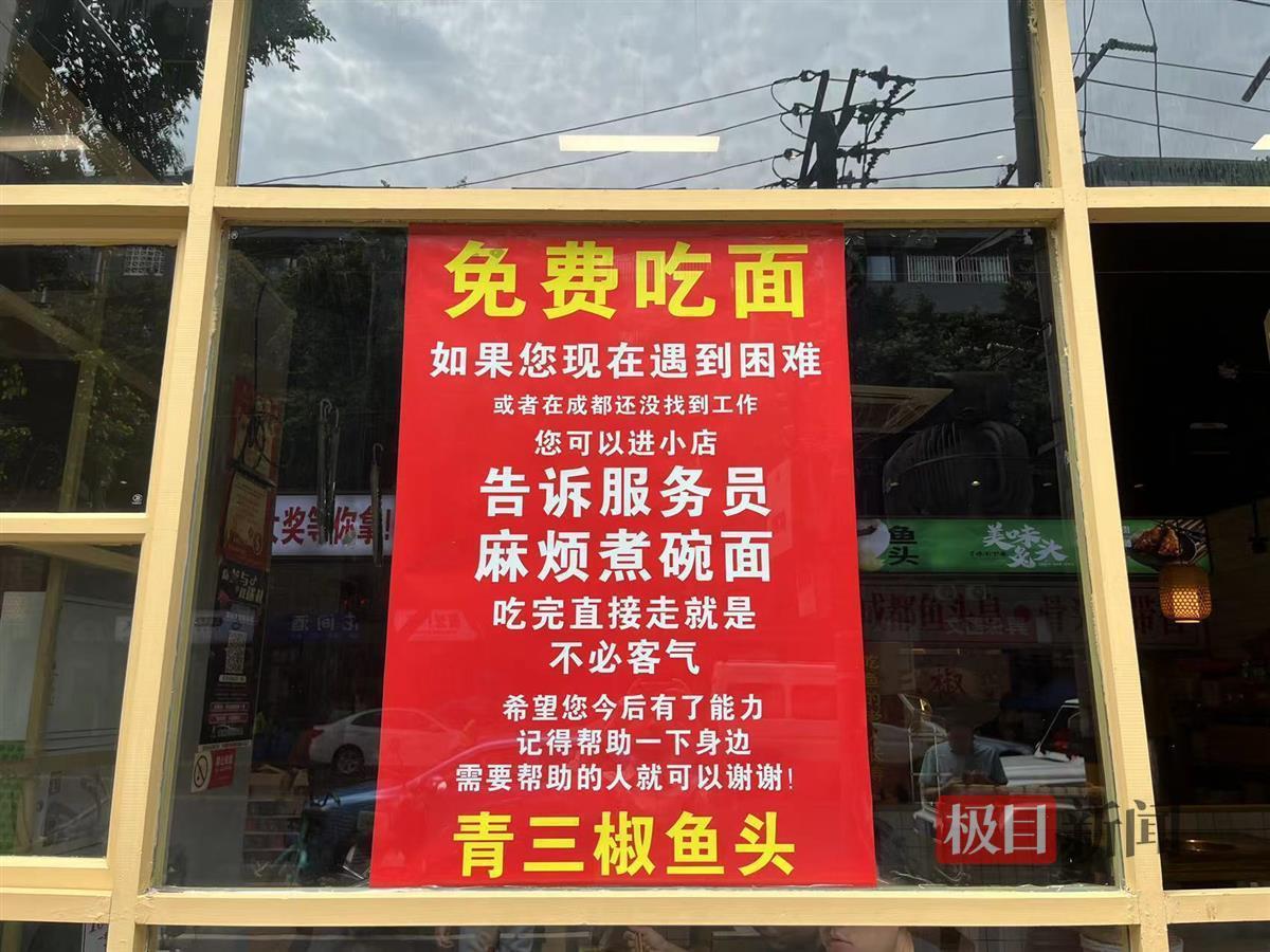 而在大门右侧的玻璃上,一张红色告示写着:“如果您现在遇到困难,或者在成都还没找到工作,您可以进小店,告诉服务员,麻烦煮碗面。吃完直接走就是,不必客气。希望您今后有了能力,记得帮助一下身边需要帮助的人就可以,谢谢。”