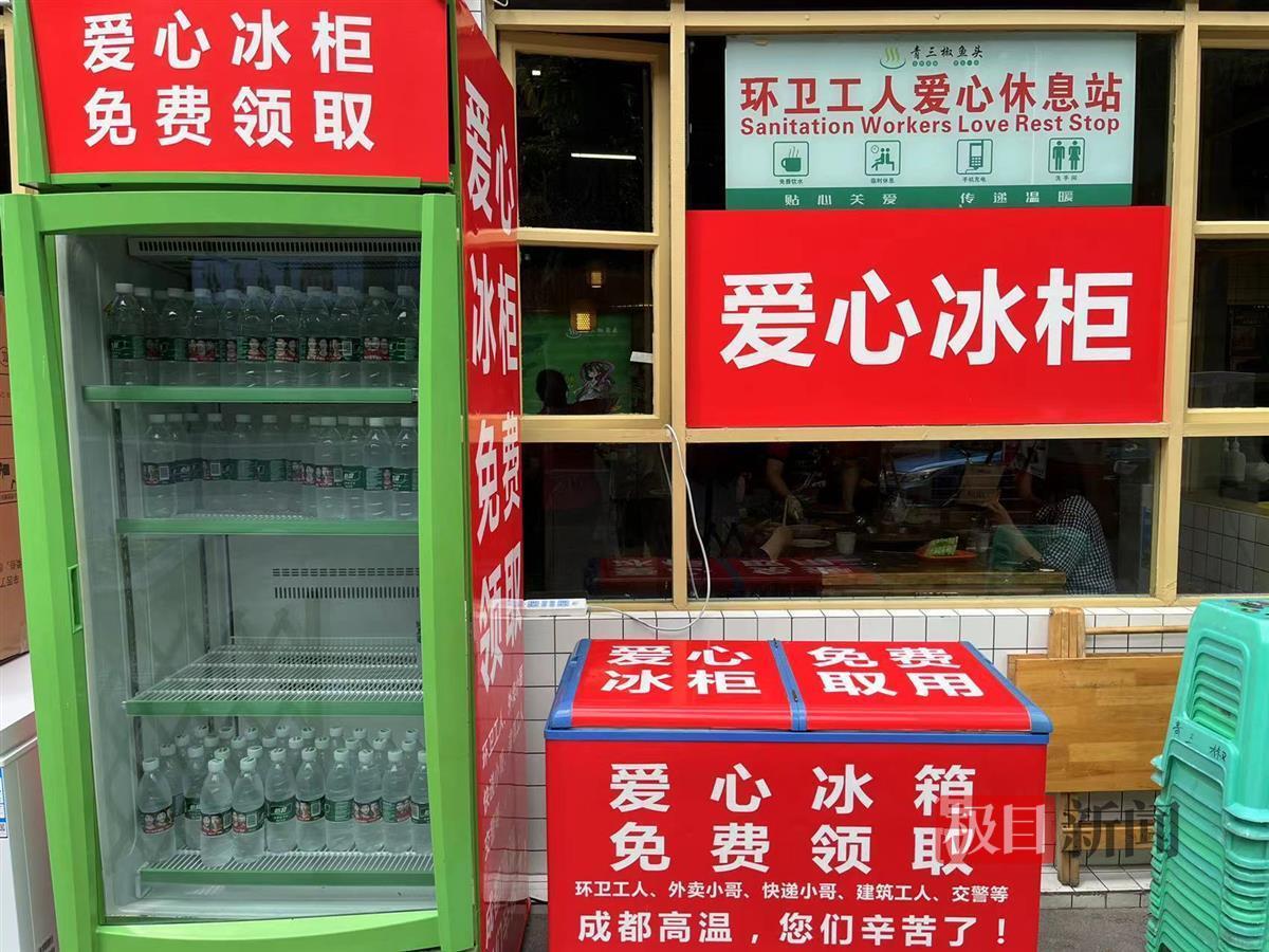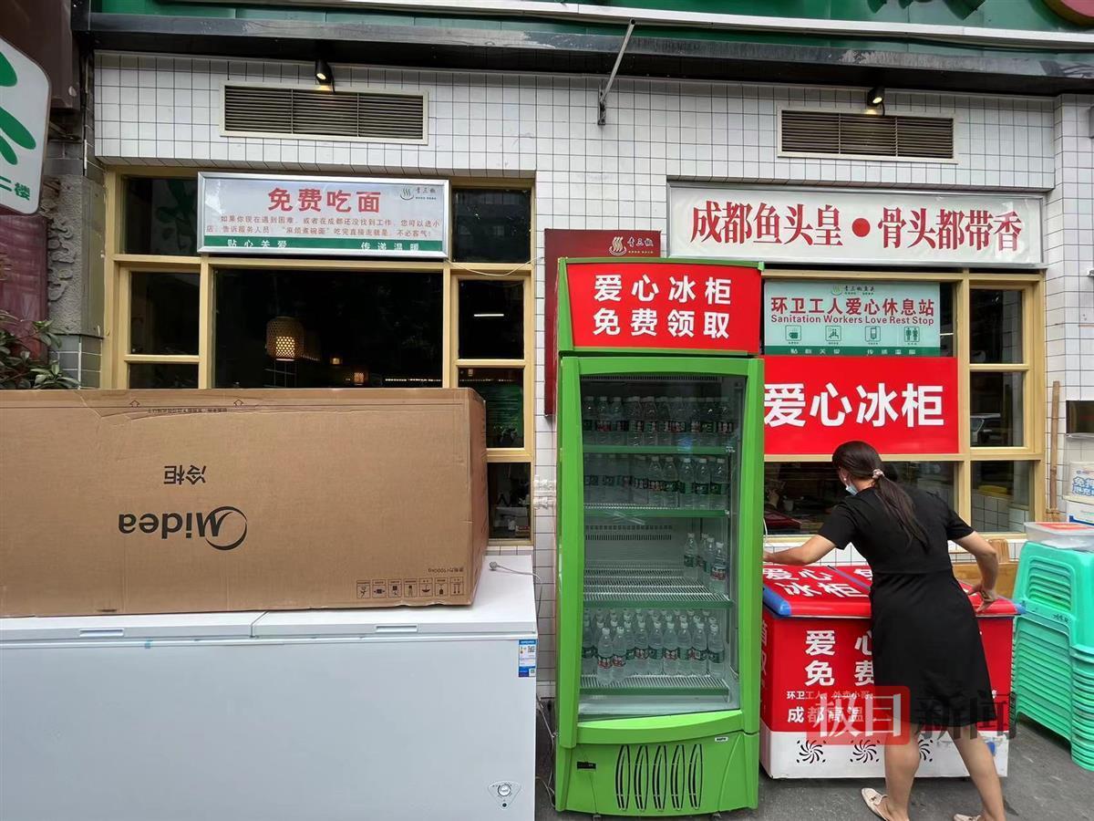 今年夏天,成都迎来了长时间的高温天气,环卫工人等户外工作者会更加辛苦。黄明将店内闲置的冰柜摆在店门口,在冰柜里放上矿泉水,并在表面贴上提示,供有需要的人消暑,缓解疲惫。不时有人从冰柜里拿水喝,店员也会不定时往冰柜里补充水。