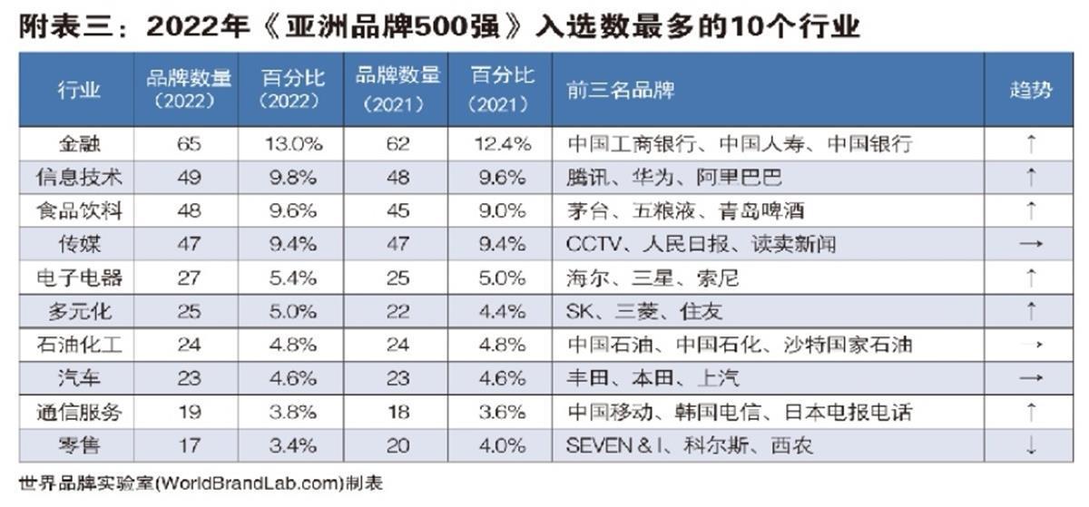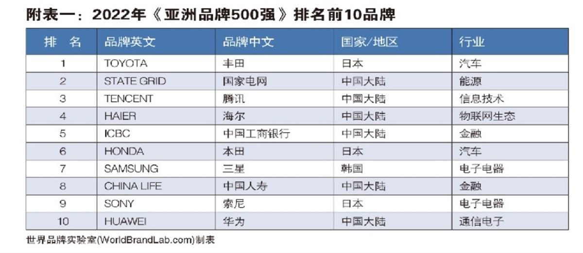 榜单显示,中国、日本和韩国是入选品牌最多的三个国家,其中丰田汽车、国家电网、腾讯名列前三,占据榜单前十名的还有海尔、中国工商银行、本田、三星、中国人寿、索尼和华为。