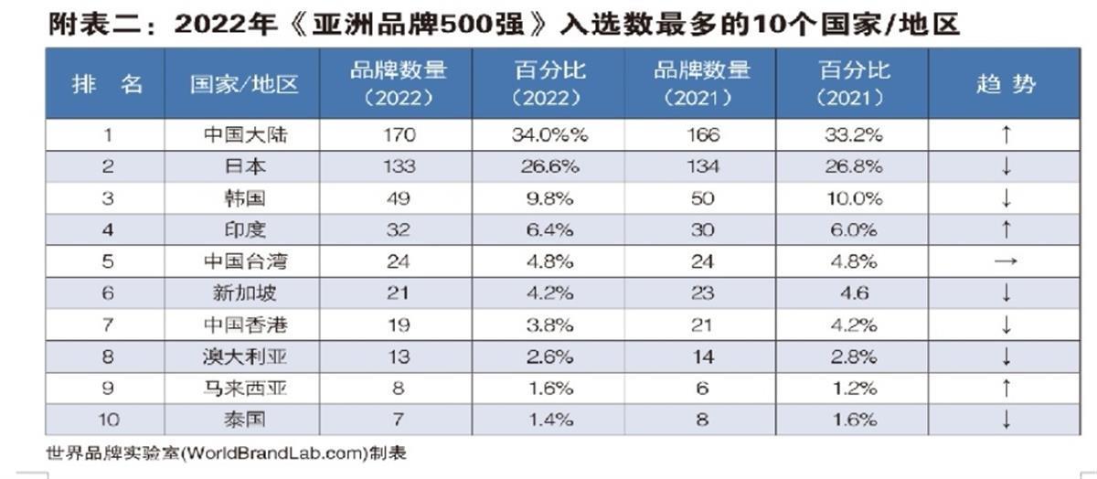 根据榜单,此次亚洲品牌500强共有20个国家和地区的品牌入选,中国(包含港澳台)入选的品牌共计214个,占整个亚洲品牌500强的42.8%,位居第一,其中中国大陆入榜品牌有170个;日本有133个品牌入选,位居第二;位居第三的是韩国,入选49个品牌。