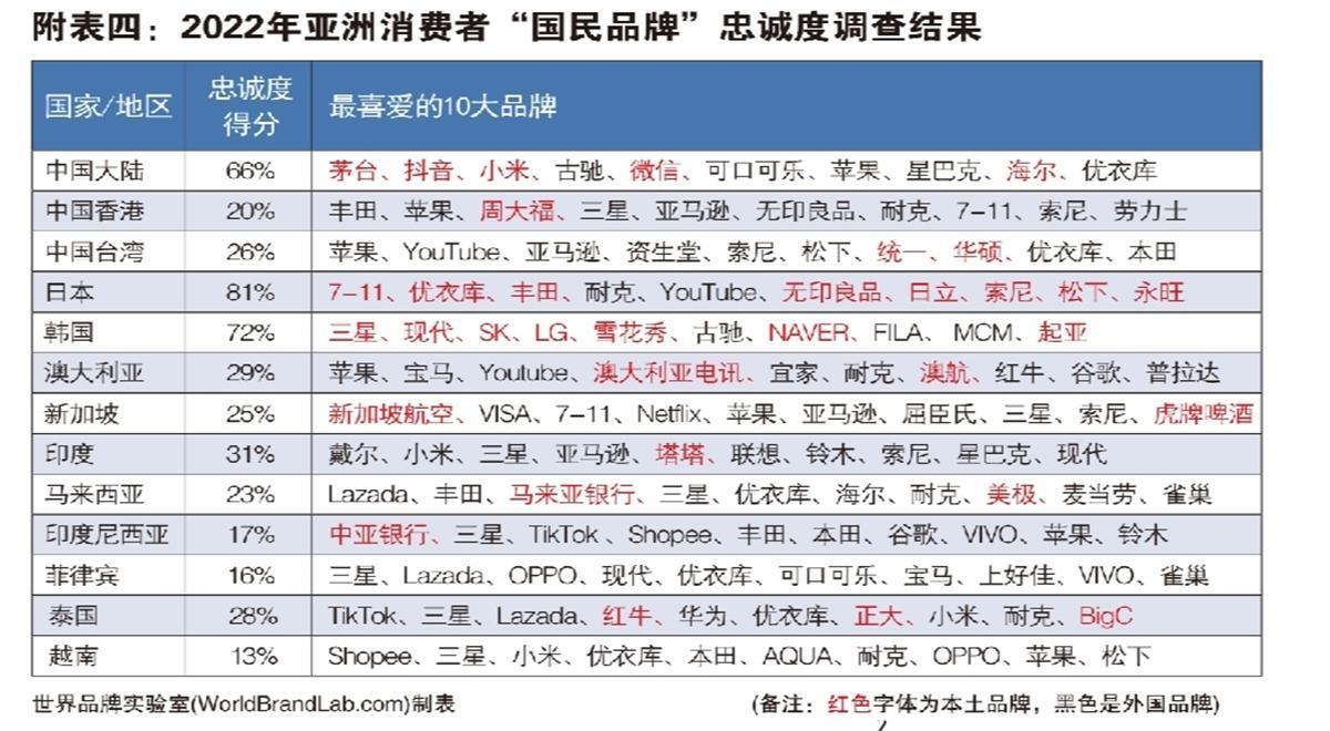对亚洲市场内部而言,各国国民的消费忠诚度差异性明显。日本消费者的国民品牌忠诚度依然最高,高达81%;韩国排名第二,忠诚度达72%;中国大陆消费者对本土品牌的热度持续走高,达到66%,排名第三。