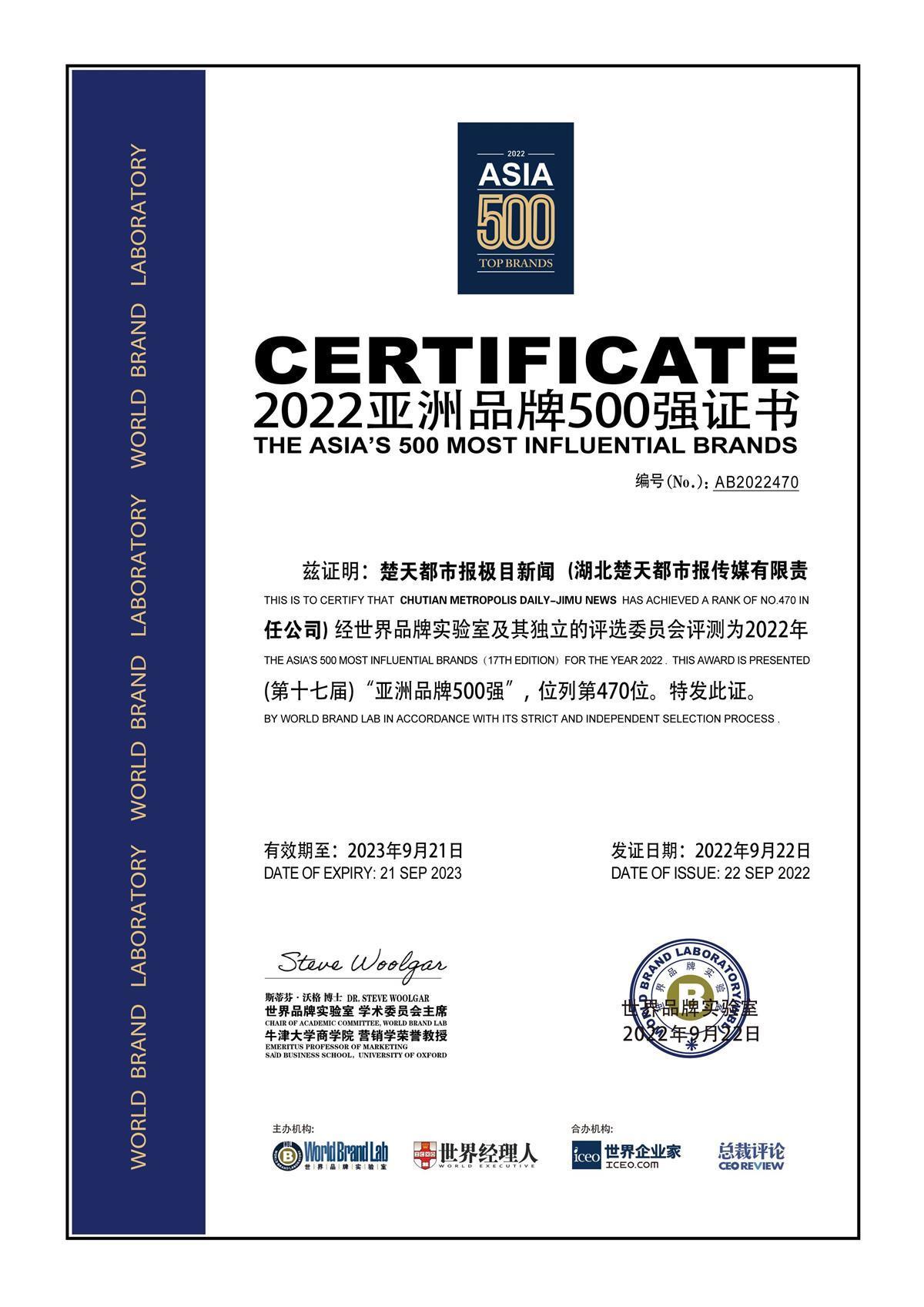 9月22日,由世界品牌实验室主办的“亚洲品牌大会”在上海召开,发布2022年《亚洲品牌500强》排行榜。楚天都市报•极目新闻作为湖北唯一入选媒体品牌,连续第9次入选亚洲品牌500强,品牌价值210.62亿元。