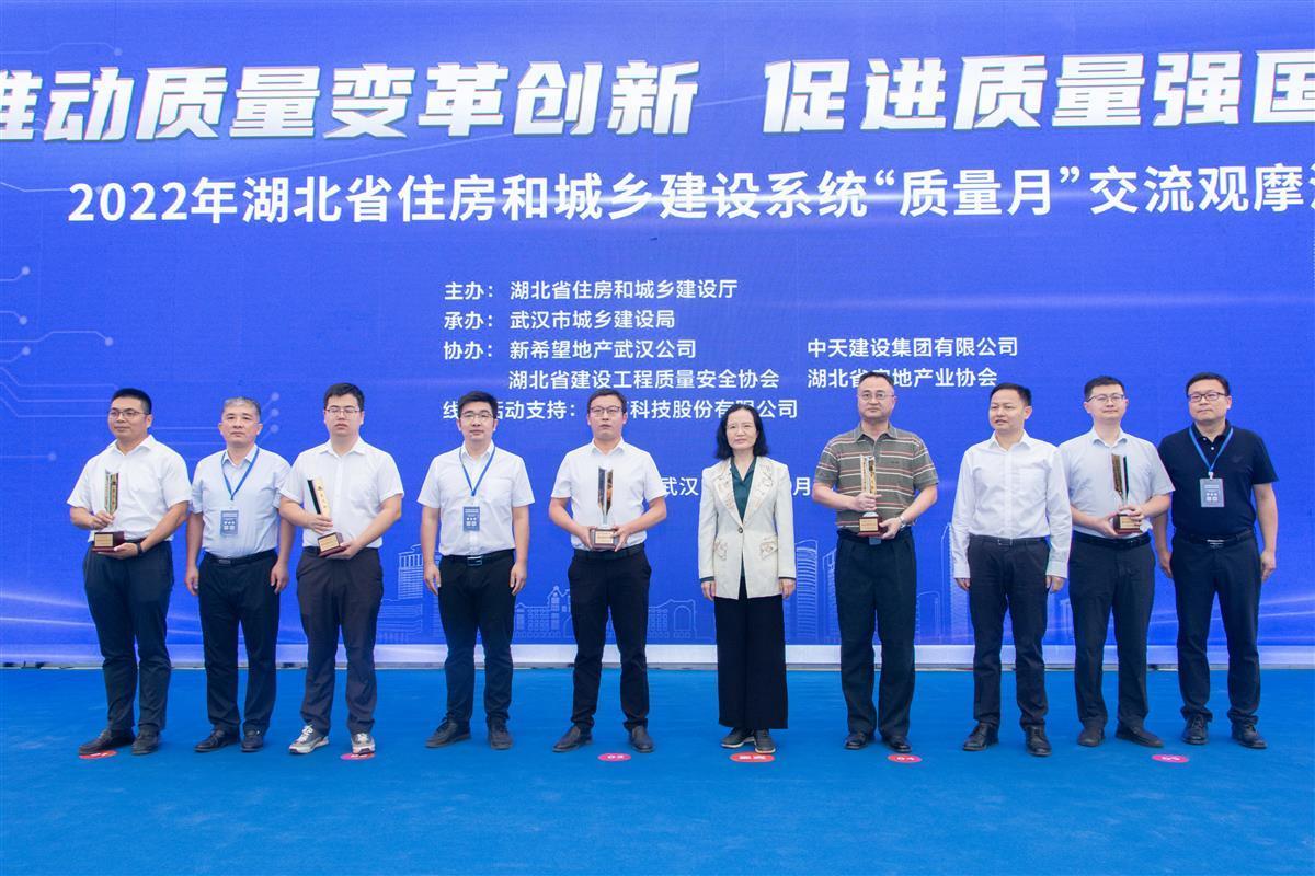 省质安总站站长杨碧华宣布省厅关于2022年省级质量月观摩项目名单的通报;宣读省厅关于2021~2022年度湖北省建设优质工程(楚天杯)获奖单位的通报。与会领导为获得2021~2022年度湖北省建设优质工程(楚天杯)的10个代表性项目颁发奖牌,中天六建副总经理姜晓峰作为“2021~2022年度湖北省建设优质工程(楚天杯)项目”企业代表登台领奖。