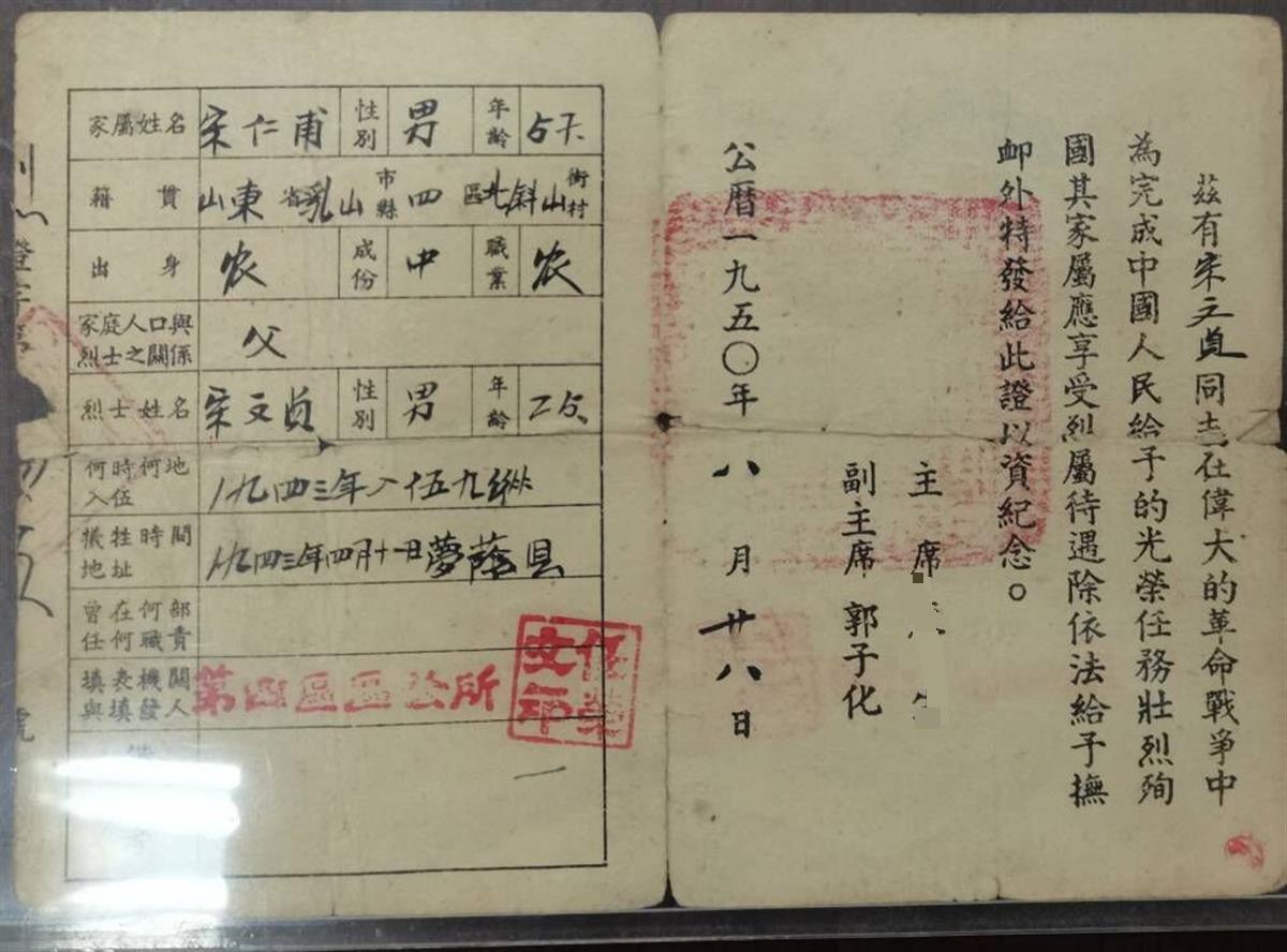 这张烈士证已轻微泛黄,但内里的字迹仍然清晰。证书上写着,烈士姓名为“宋文贞”,1943年入伍“九纵”,同年四月十日于蒙阴县牺牲。此外,证书上还清晰记录着其父亲的姓名“宋仁甫”,籍贯为“乳山四区北斜山村”。